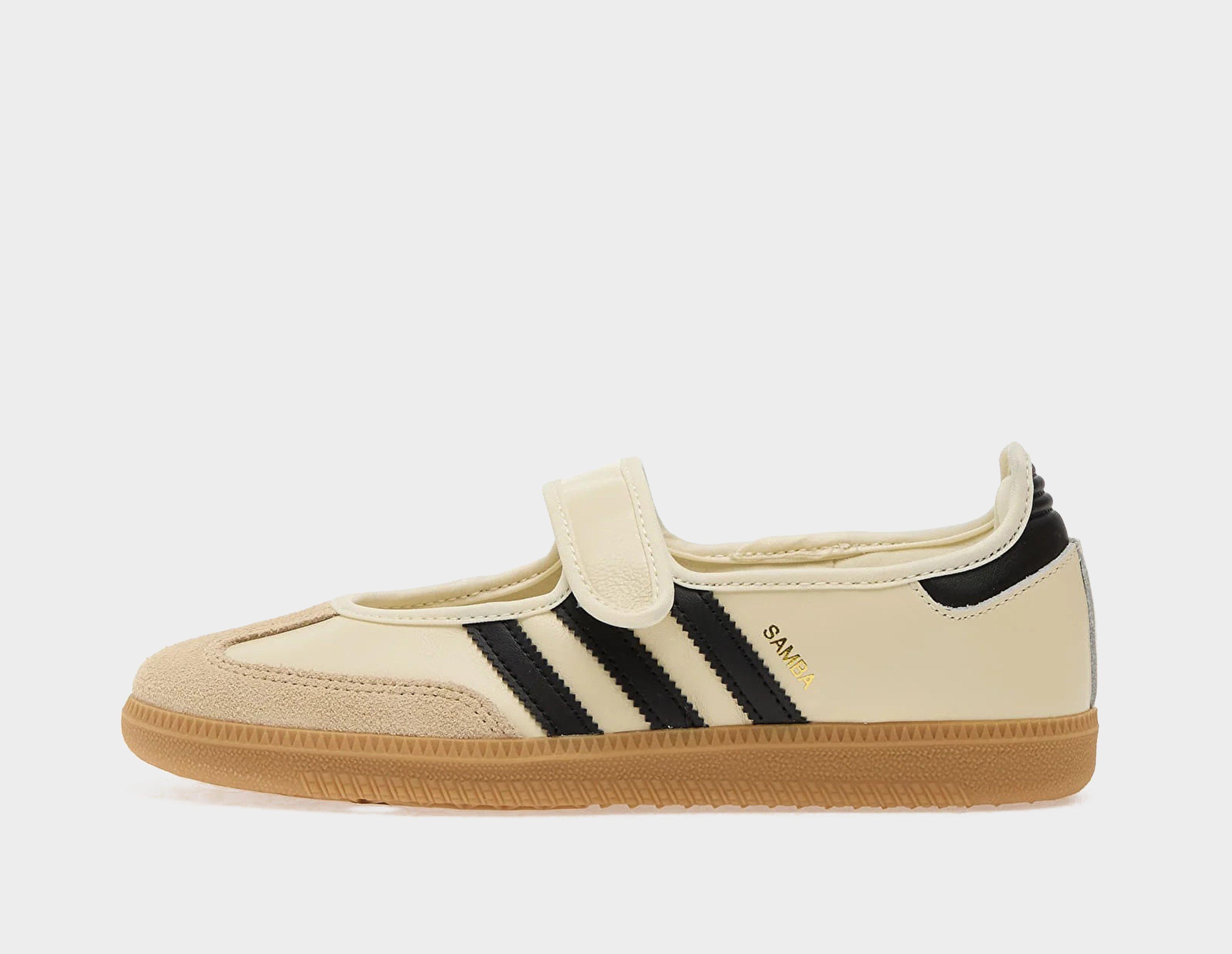 Forever reinventing itself, the Samba is back for spring/summer with an all-new Mary Jane aesthetic. Meet the adidas Samba Jane. Familiarly, the upper is built from leather with a suede T-toe overlay - this time in classic cream and white - however, the laces have been replaced with a midfoot strap. Satin lining offers a luxe touch, while a gum rubber sole unit grounds the design. Perfection. | JR7338