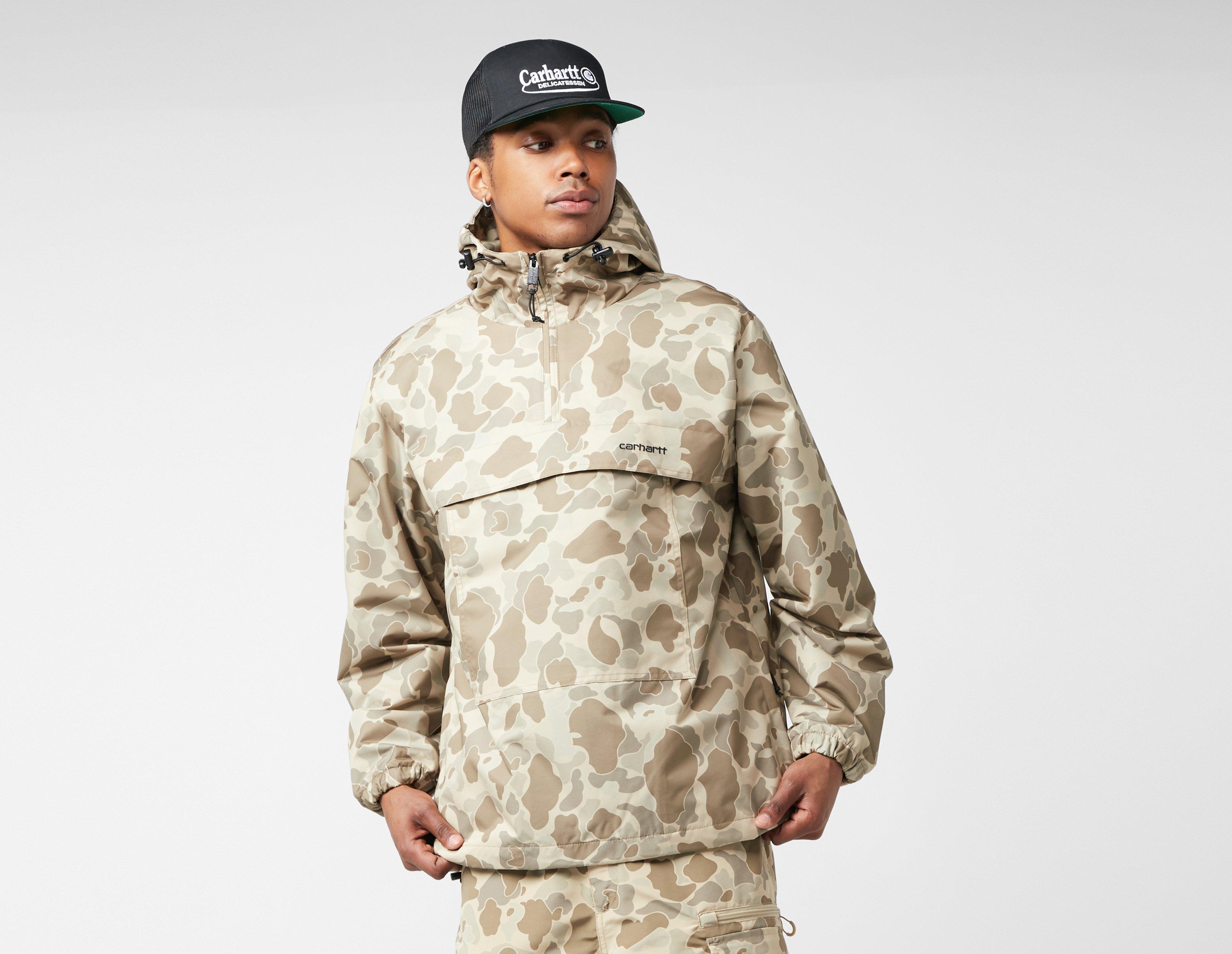 Mesh-lined, Carhartt WIP's Windbreaker Pullover is a lightweight 'Duck Camo' layer that's engineered from water-repellent 4.7oz polyester plain weave fabric. An adjustable hood lines the neck, while both zipped and hand pocket functionality stash your essentials and Script Logo embroidery adorns the chest. | our model is 6'2'' and wears a size medium