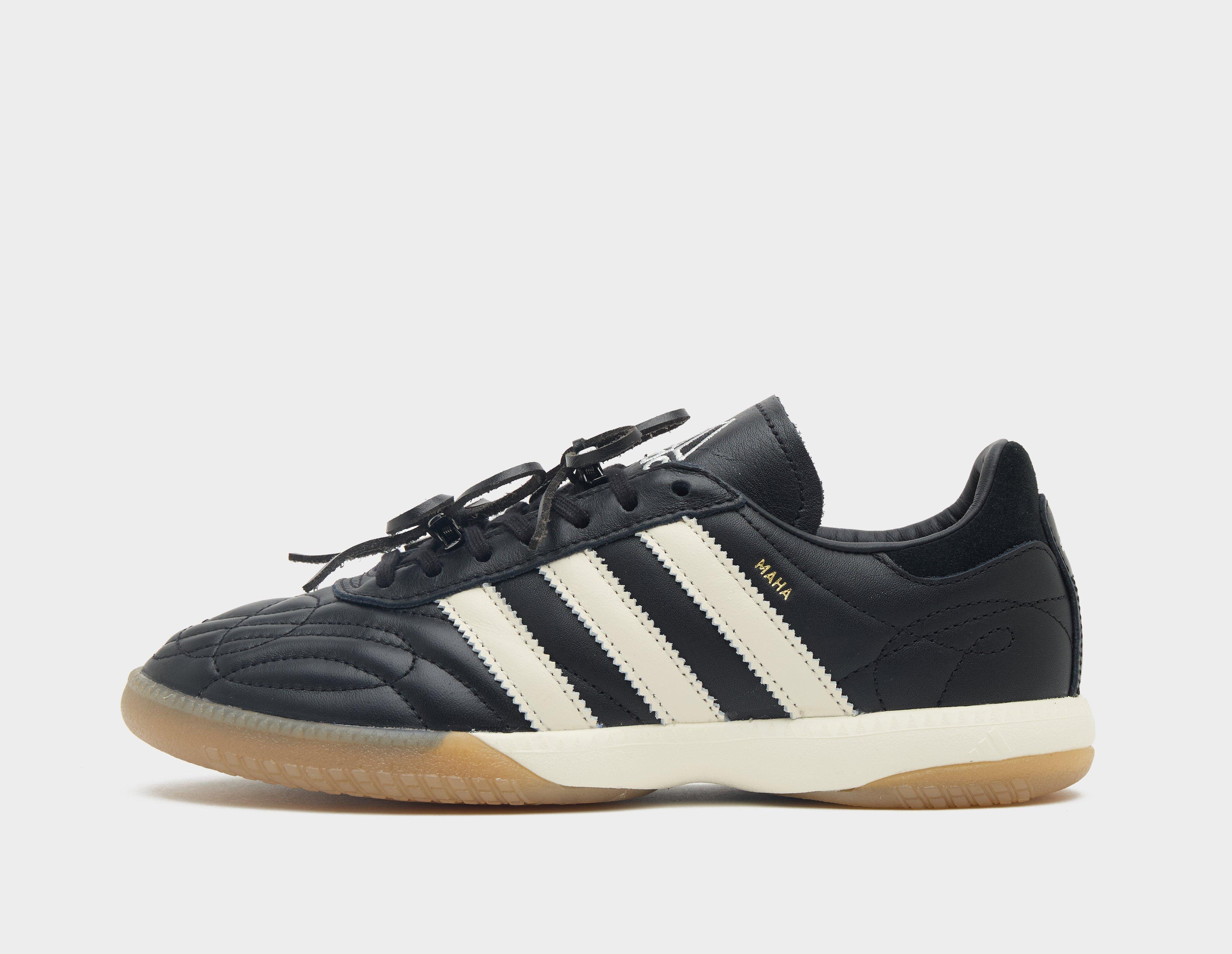As part of a triple collaboration, adidas teams up with NAKED Copenhagen and Amsterdam's Maha to present a reimagined edition of the Samba MN. The upper is treated to a premium black leather upper with a romanticised take on boot-style embroidery that loops across the design, interrupted only by off-white chunky 3-Stripes. Underfoot, the white and gum rubber outsole draws a line under the silhouette, while extended leather lace bows and gold co-branded accents finish things off with a luxurious touch. | IH3566