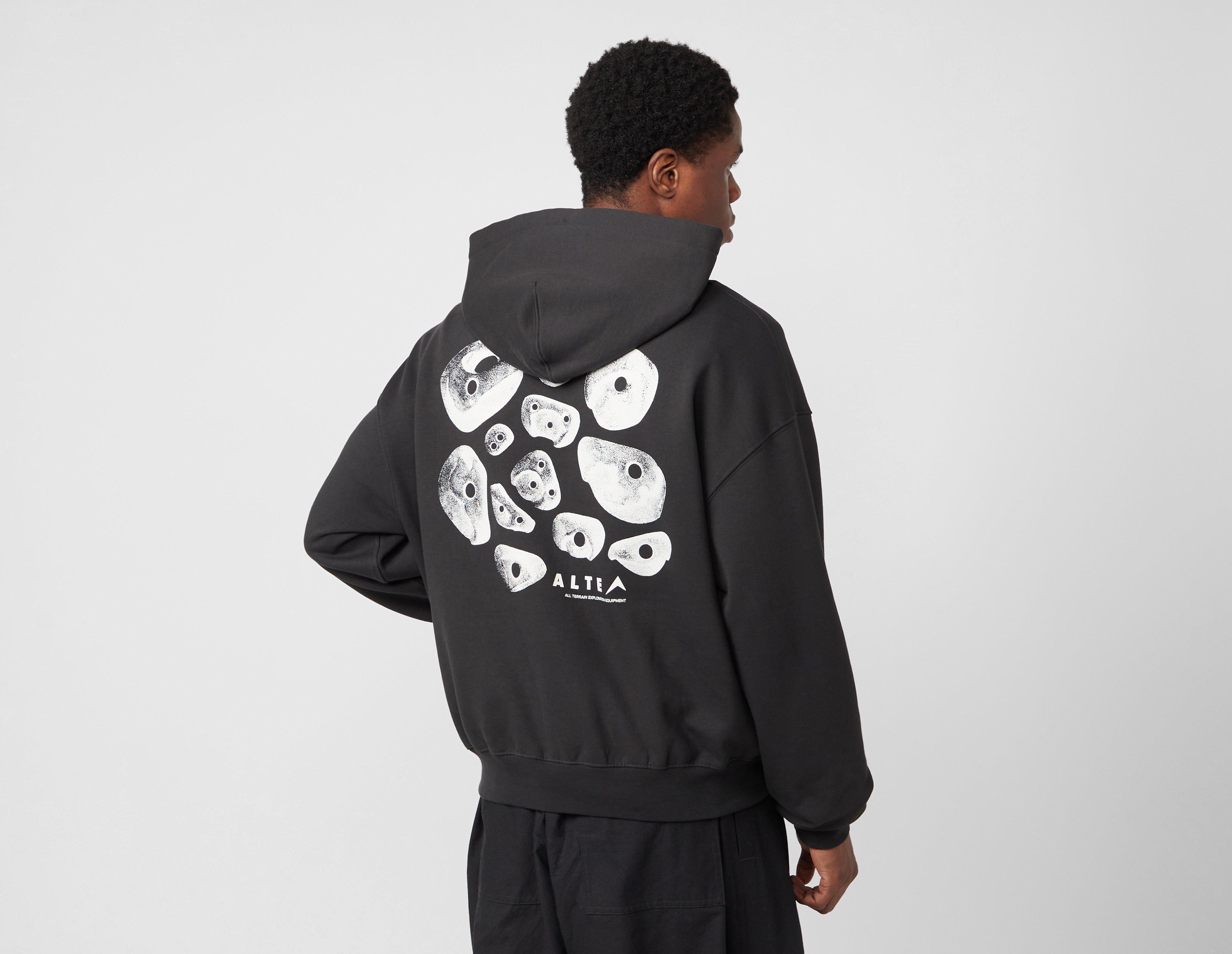 An antidote to the rigid world of active performance, ALTE blends style, functionality and aesthetics, adapting to your lifestyle. Cut and finished with a contemporary take the heavyweight Grip Hoodie in charcoal has a boxy fit with graphic print on the back. | our model is 6'2" and wears a size medium