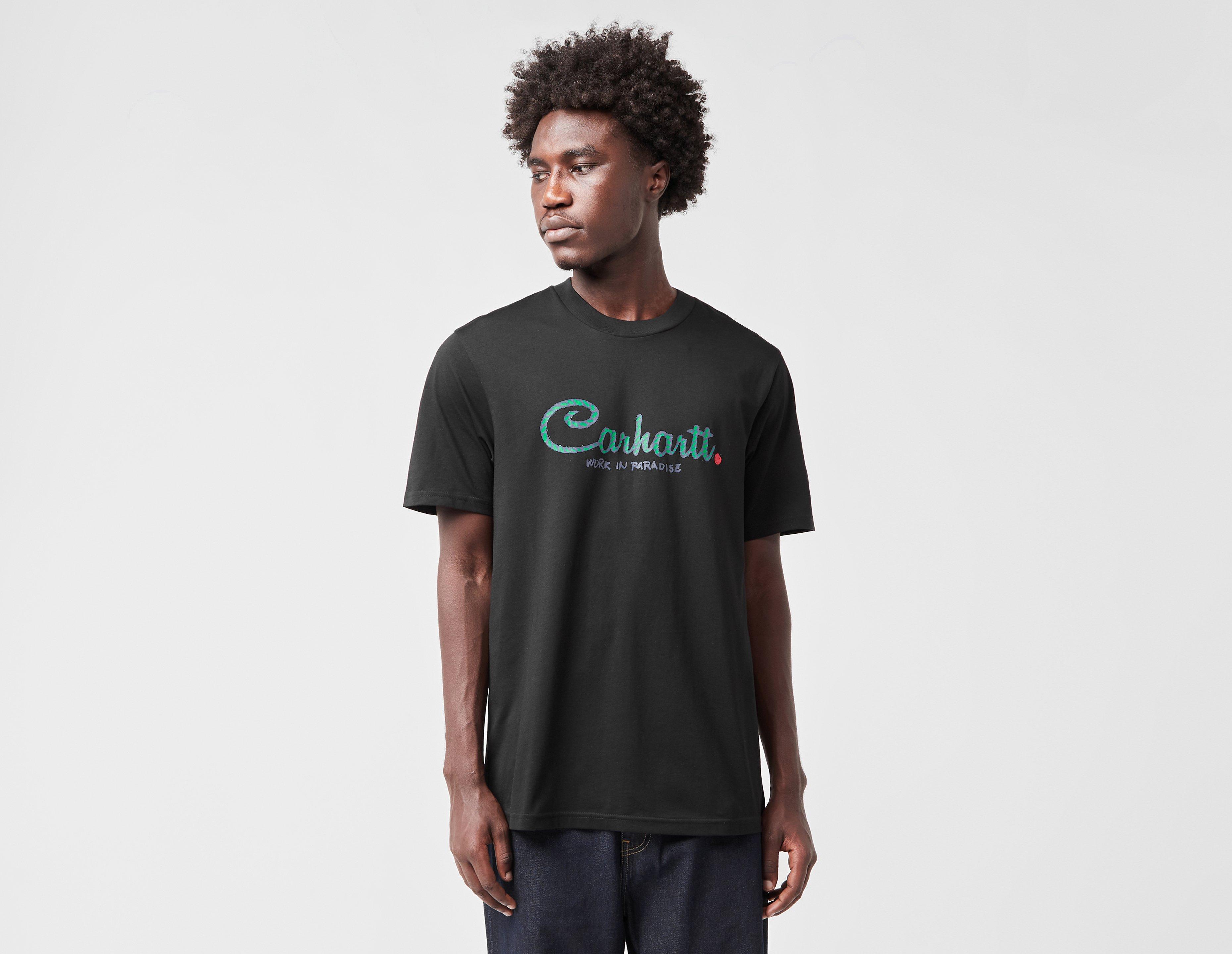 Carhartt Work in Progress Or is it Paradise? A staple black tee ideal for layering, the Paradise Script T-shirt is crafted from breezy lightweight organic cotton and features a graphic print on the chest. | our model is 6'2" and wears a size medium