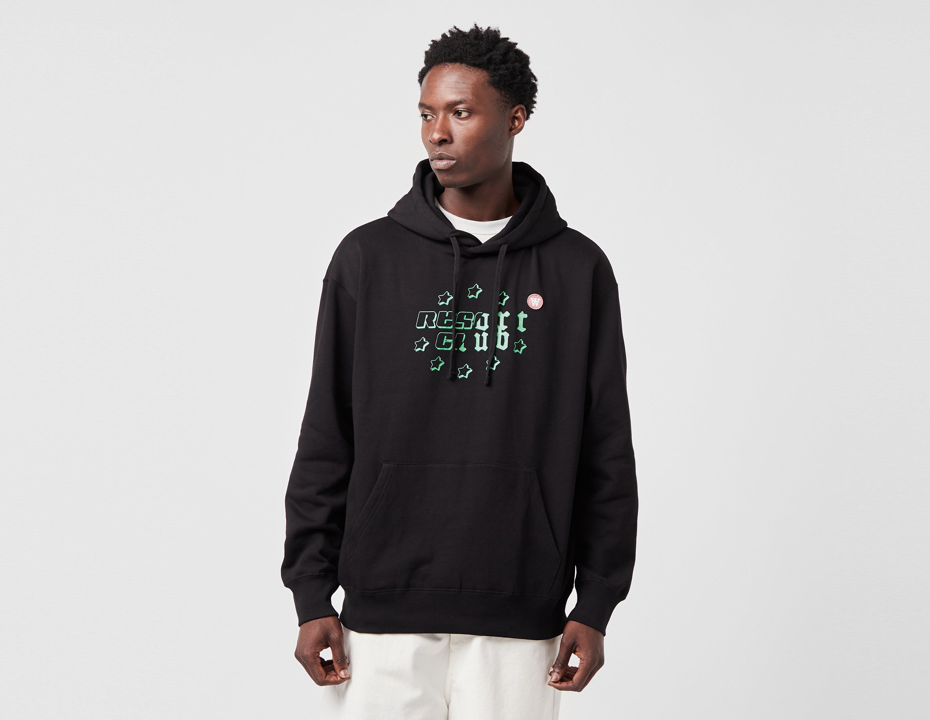 Double A by Wood Wood present the relaxed fit Cass Resort Club Hoodie in a black hue crafted from organic cotton. Ribbed cuffs, a drawstring hood and graphic prints join the embroidered moniker. | our model is 6'2" and wears a size medium