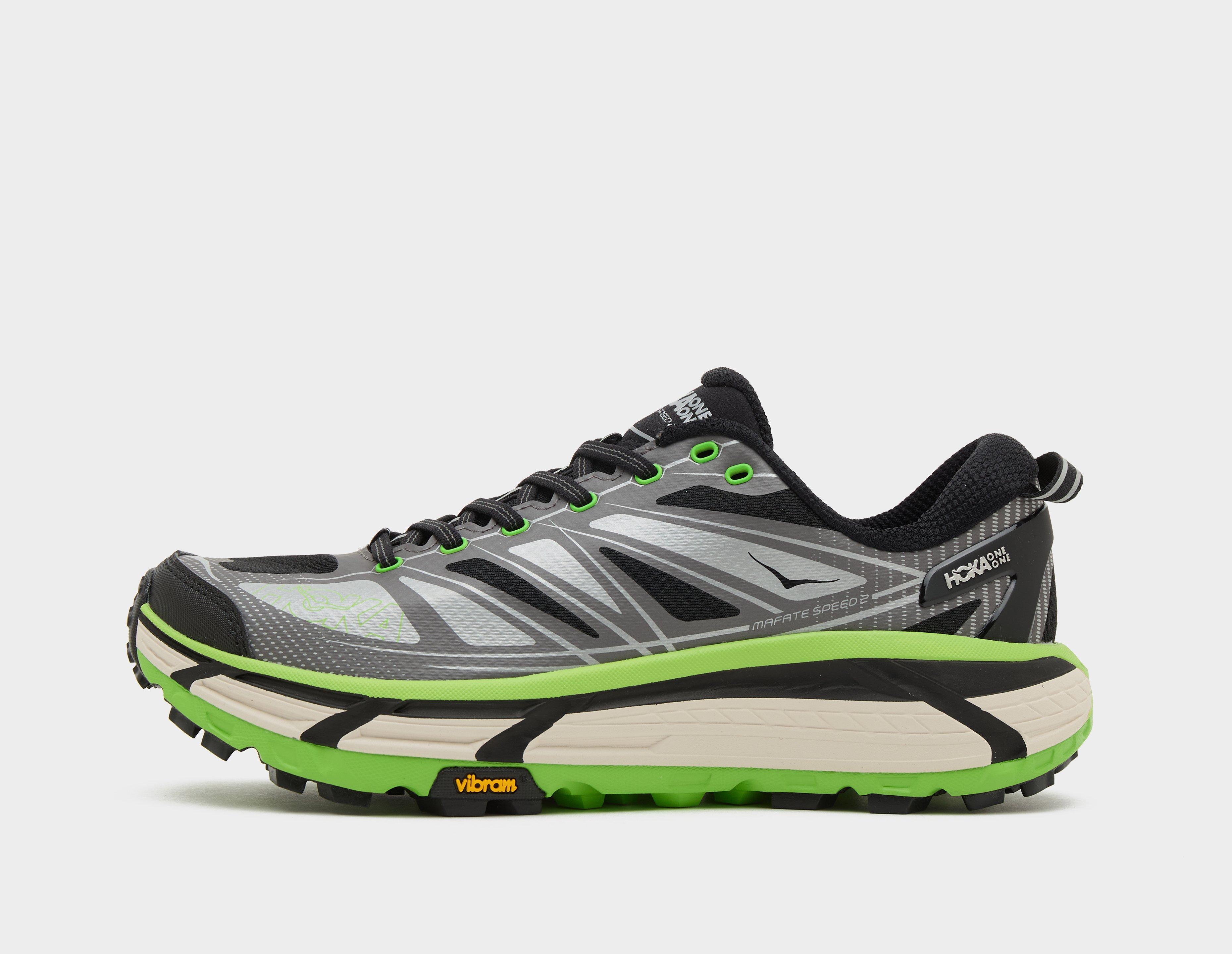 Designed to go the distance on technical terrain, HOKA's Mafate Speed 2 has features that will make trail adventures a breeze. Clad in 'Electric Green' and black, the silhouette is invigorated with luminous detailing, while the Meta-Rocker offers a smooth run and propels you further. Underfoot, the Vibram Megagrip outsole keeps you steady no matter where the trail takes you. | 1126851-BCKLC