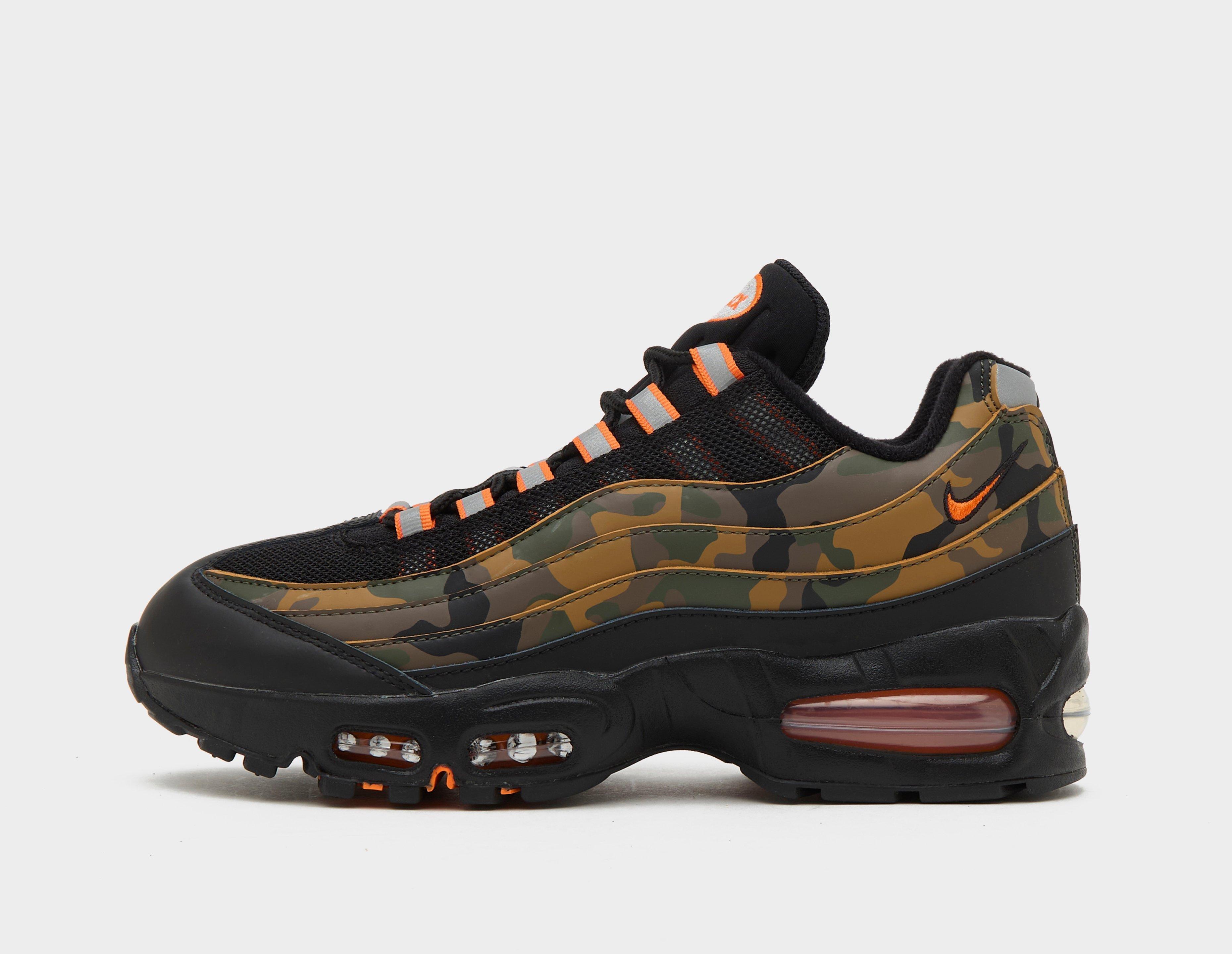Over the past 30 years, Sergio Lozano's Air Max 95 has been a cornerstone of street style, boasting a roster of colourways and collaborations that reaches into the thousands. Arriving with a darker take on a camo palette, this iteration of the Air Max 95 puts a twist on the muscle-inspired upper by switching out traditional suede layers for synthetic leather painted in 'Golden Beige', 'Cargo Khaki' and 'Old Moss' camo. A black toe and mudguard match the airy mesh, while reflective accents illuminate the design in low light. Anchoring the silhouette is a black midsole that houses seamed 'Big Bubble' Air units, while hits of orange interject on the spine-like outsole. | HQ1973-001