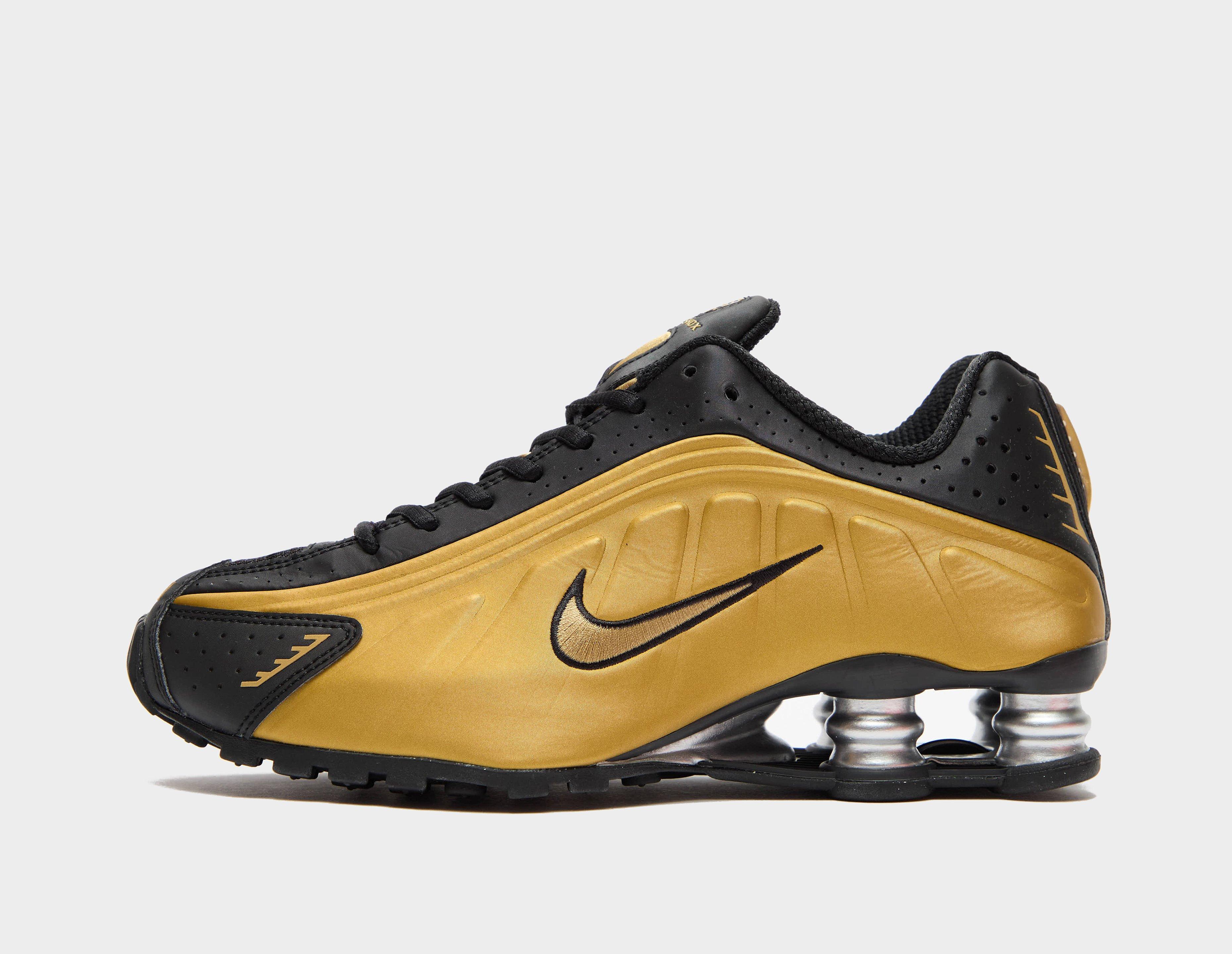 Designed by Bruce Kilgore, the Nike Shox R4 made its debut in 2000 - 16 years after Shox technology was originally developed. Expanding its lineup, Nike presents a black and 'Metallic Gold' edition, which features laser perforations and fluid ripples on the astronaut-inspired upper. The bounce comes from underfoot with four 'Metallic Silver' compressive columns at the heels. | AR3565-005