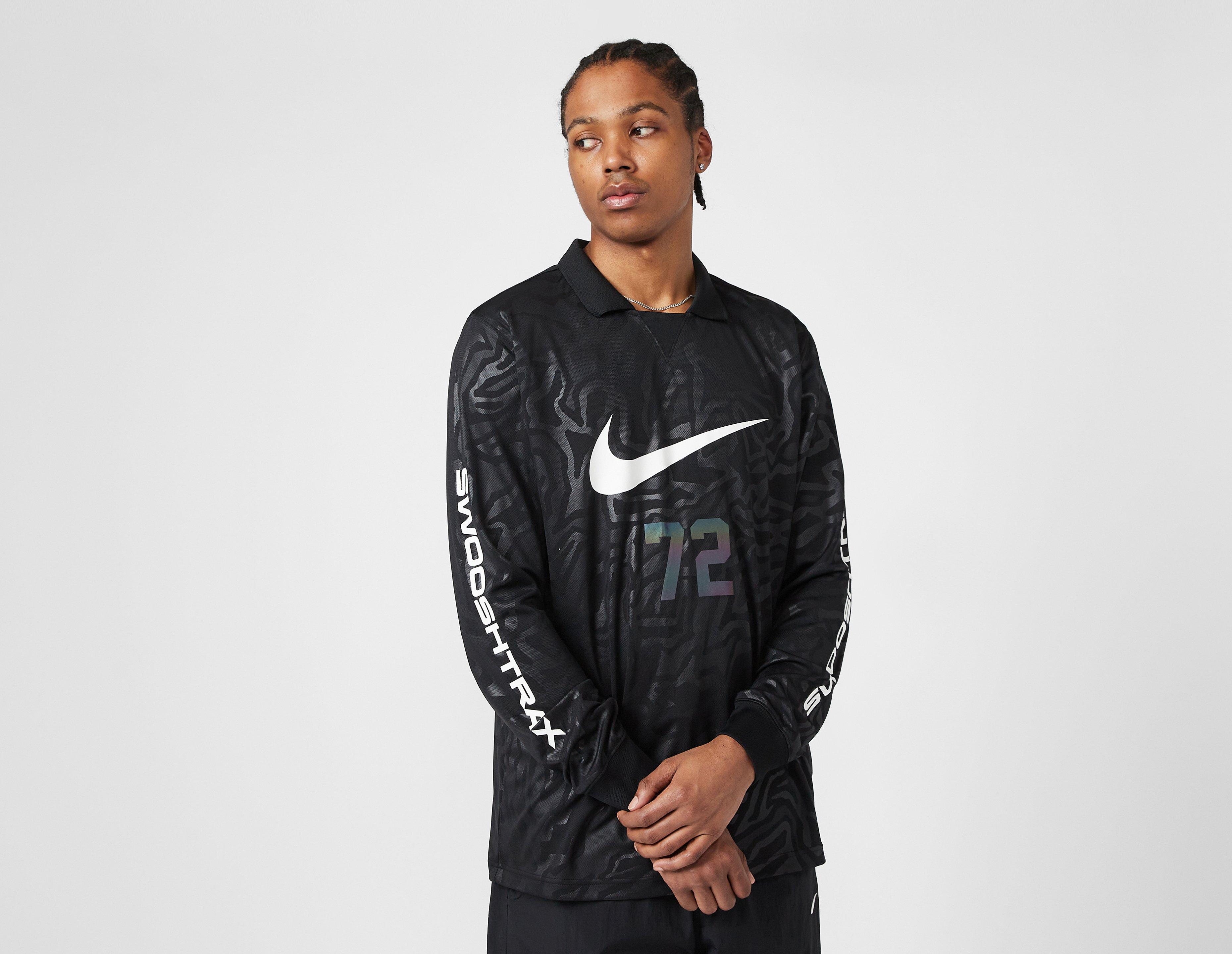 The Nike Sportswear Long Sleeve Top oozes an eclectic design inspired by the sounds of the underground. Spun from a polyester knit with a roomy fit through the shoulders, reflective 'Swoosh Trax' graphics and labeling adds a dose of Beaverton heritage. | DX0048-010 | our model is 6'2" and wears a size medium