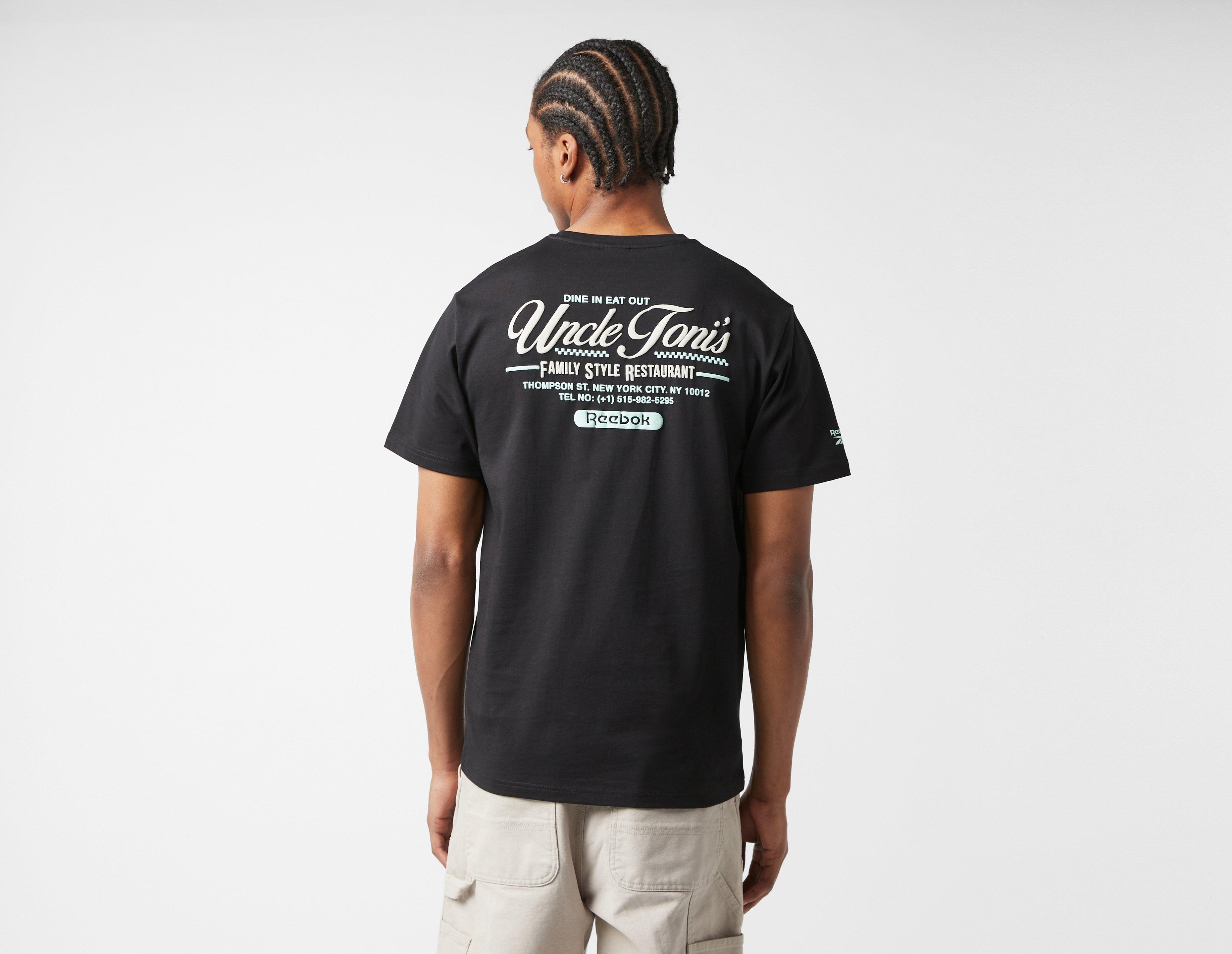 The Reebok Toni's T-Shirt - size? exclusive is cut from 260gsm cotton to a boxy fit. Graphic prints adorn the front and reverse. | our model is 6'2'' and wears a size medium