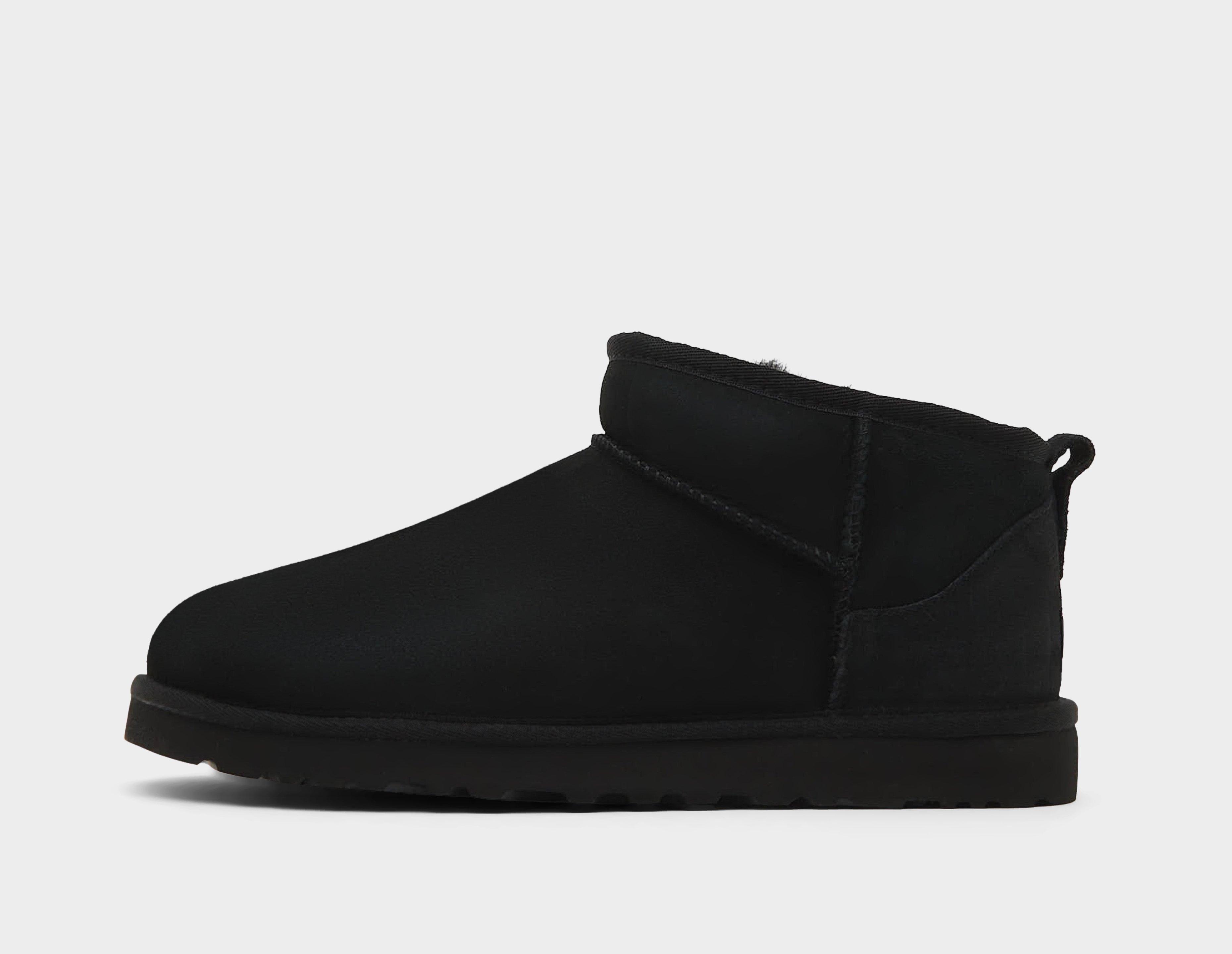 UGG presents its most iconic silhouette, but this time it's a little shorter - the Classic Ultra Mini has all the same features with a lower shaft height. Signature sheepskin uppers feature overlock stitch details and is lined with luxurious UGGplush. Below, comfort knows no bounds with a Treadlite outsole, and to finish, a leather UGG embossed logo on the heel and a rear pull tab for easy access. | 1137391BLK