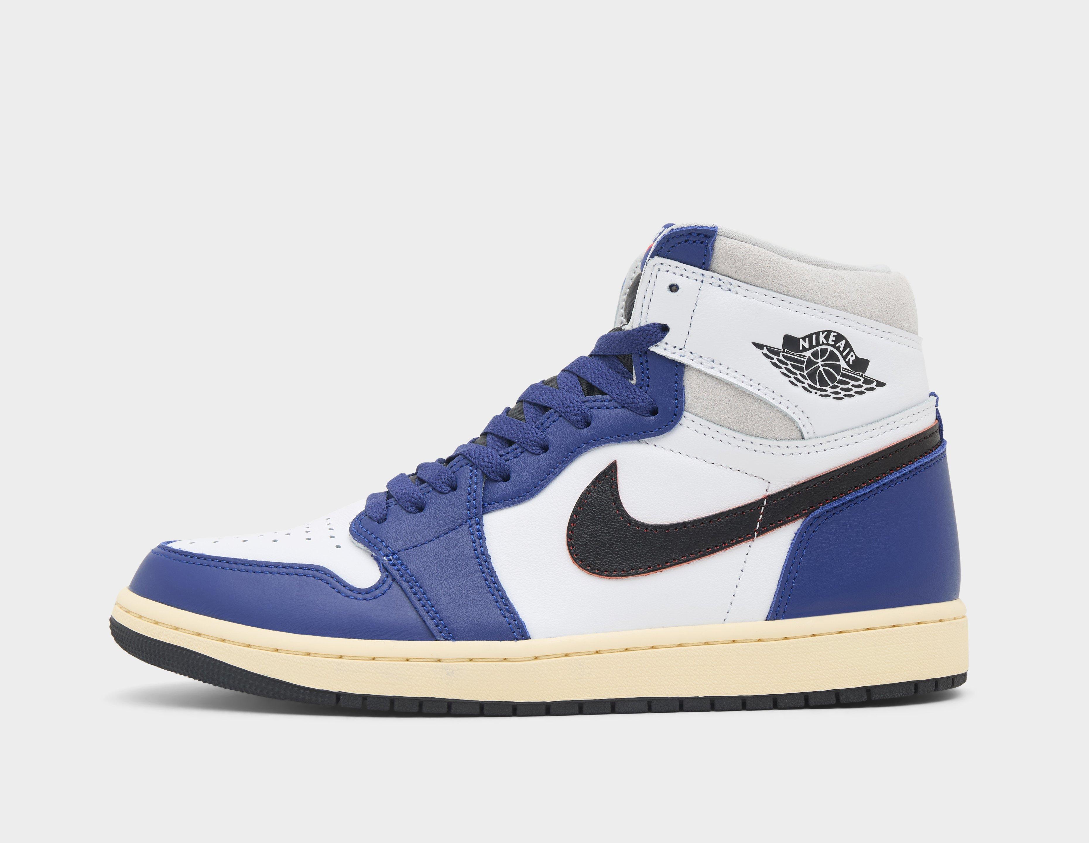 The Air Jordan 1 Retro High OG 'Rare Air' pays homage to the trial-and-error design process of the label's most impactful model. A basketball kingpin, the premium white leather upper features 'Royal Blue' panelling and prototypal 'NIKE AIR' Wings insignias, while a perforated toe box ensures ventilatory quality. Underfoot, Nike Air cushioning is underpinned by hoops pivot circle outsoles bred for the hardwoods. | FD1413-100