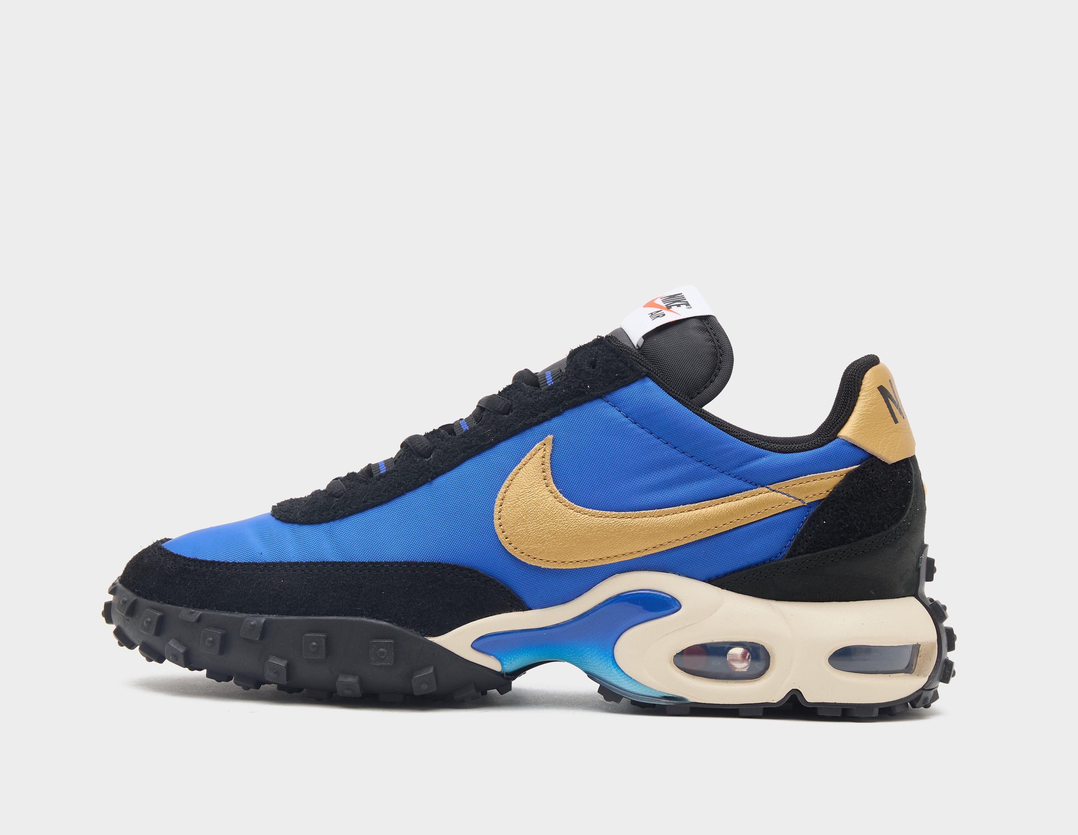 A true hybrid, Nike's Air Max Waffle is what happens when you fuse the Waffle Racer and the Air Max Plus into one combined recipe. The 'Hyper Blue' nylon upper hosts black suede overlays and 'Metallic Gold' accents, while the sole unit embodies the best of both lineages through a daring construction that houses a Tn-inspired midfoot shank and visible Nike Air units as well as a waffled rubber forefoot. | FV6946-400