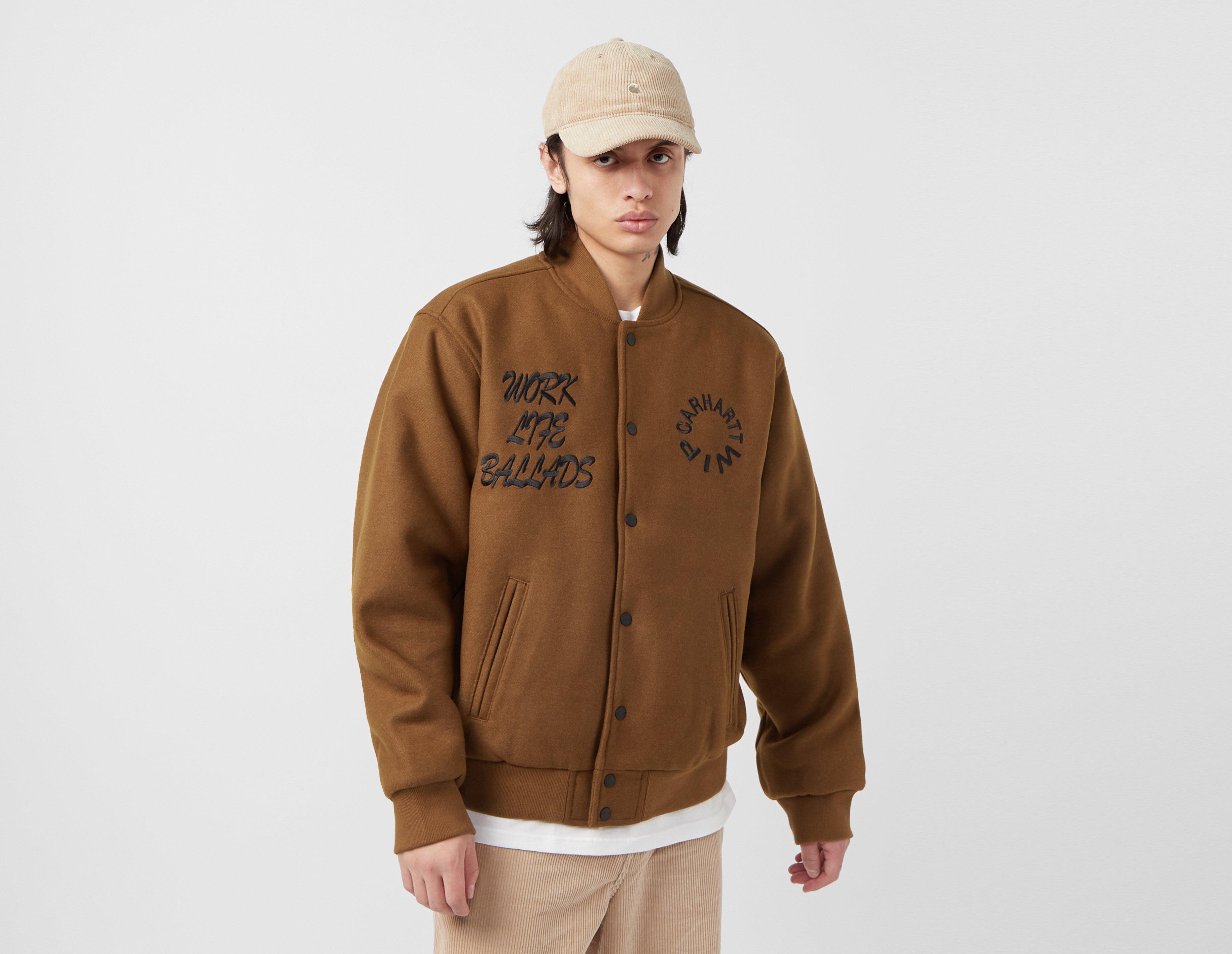 Heavyweight materials and a brown guise arrive in the Carhartt WIP Work Varsity Jacket. Featuring a rib knit collar and satin lining, it oozes functionality thanks to its popper fastening and multiple pockets. Carhartt WIP branding on the chest adds a heritage finish.