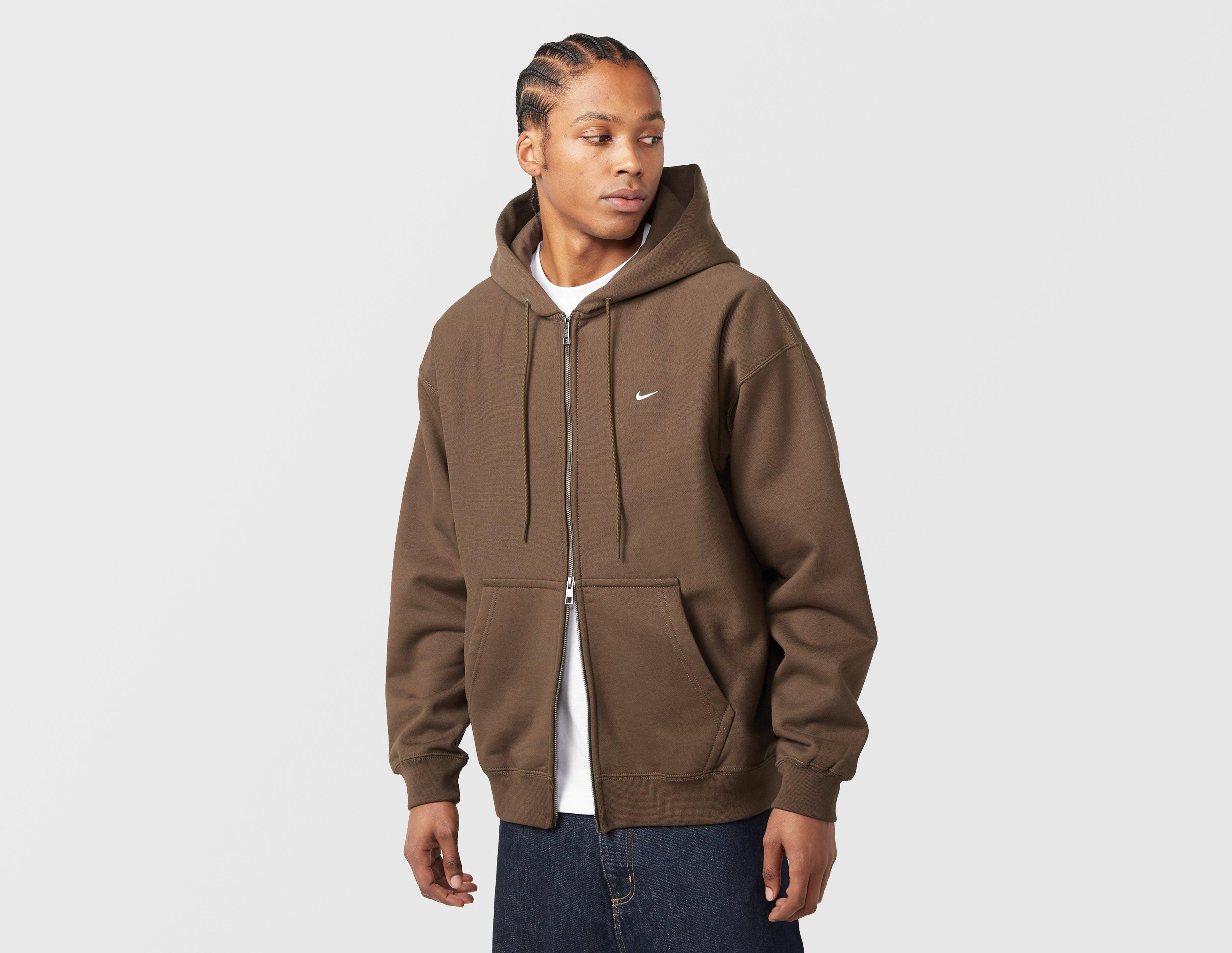 The Nike Solo Swoosh Full-Zip Fleece Hoodie is cut from brushed heavyweight 'Dark Hazel' fleece to a loose fit with a lined hood and two-way zip. A contrast Swoosh insignia adorns the chest. | HV1084-212 | our model is 6'2'' and wears a size medium