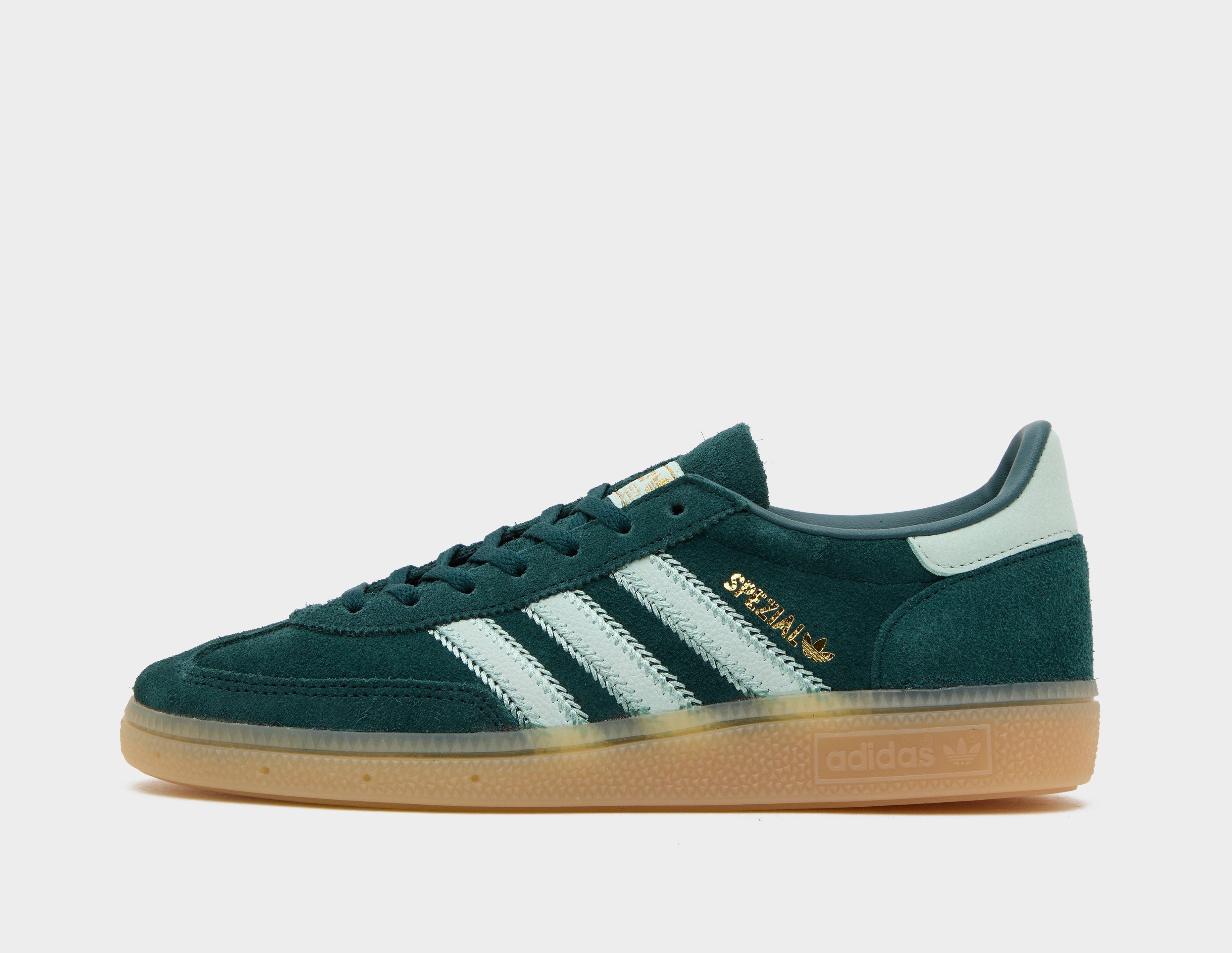 A certified classic, adidas' iconic Handball Spezial returns in an 'Aurora Ivy' and 'Ash Green' outfit. Built from soft green suede, the upper is hit with contrasting shades via the retuned stitched leather 3-Stripes, while underfoot, a classic gum rubber sole unit finalises the design. | JR0847