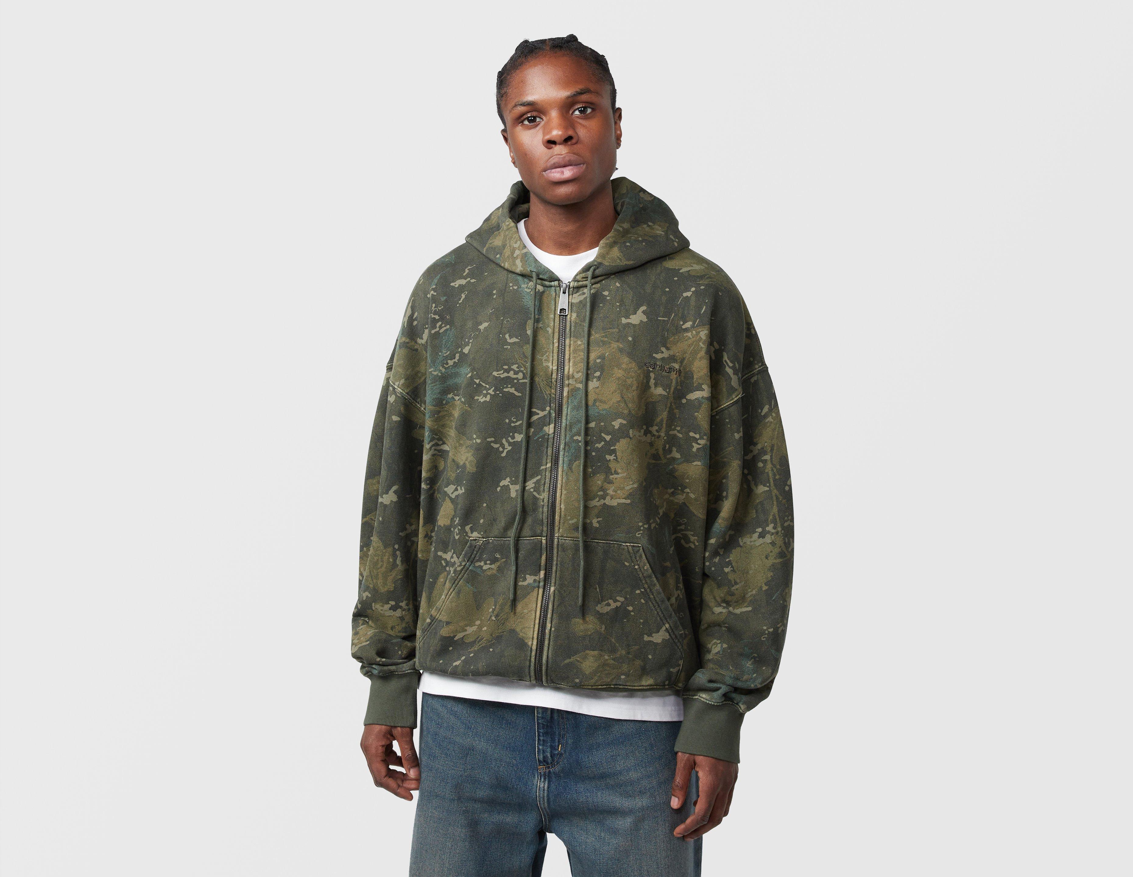 Arriving in 'Camo Combi' and 'Green', Carhartt WIP's Benton Zip Hoodie is built from unbrushed heavyweight cotton jersey and cut to a loose, boxy fit. Featuring an embroidered Script Logo on the chest, this zip-up has been garment-dyed for a softer touch and deeper colour complexity. | our model is 6'0.5" and wears a size medium