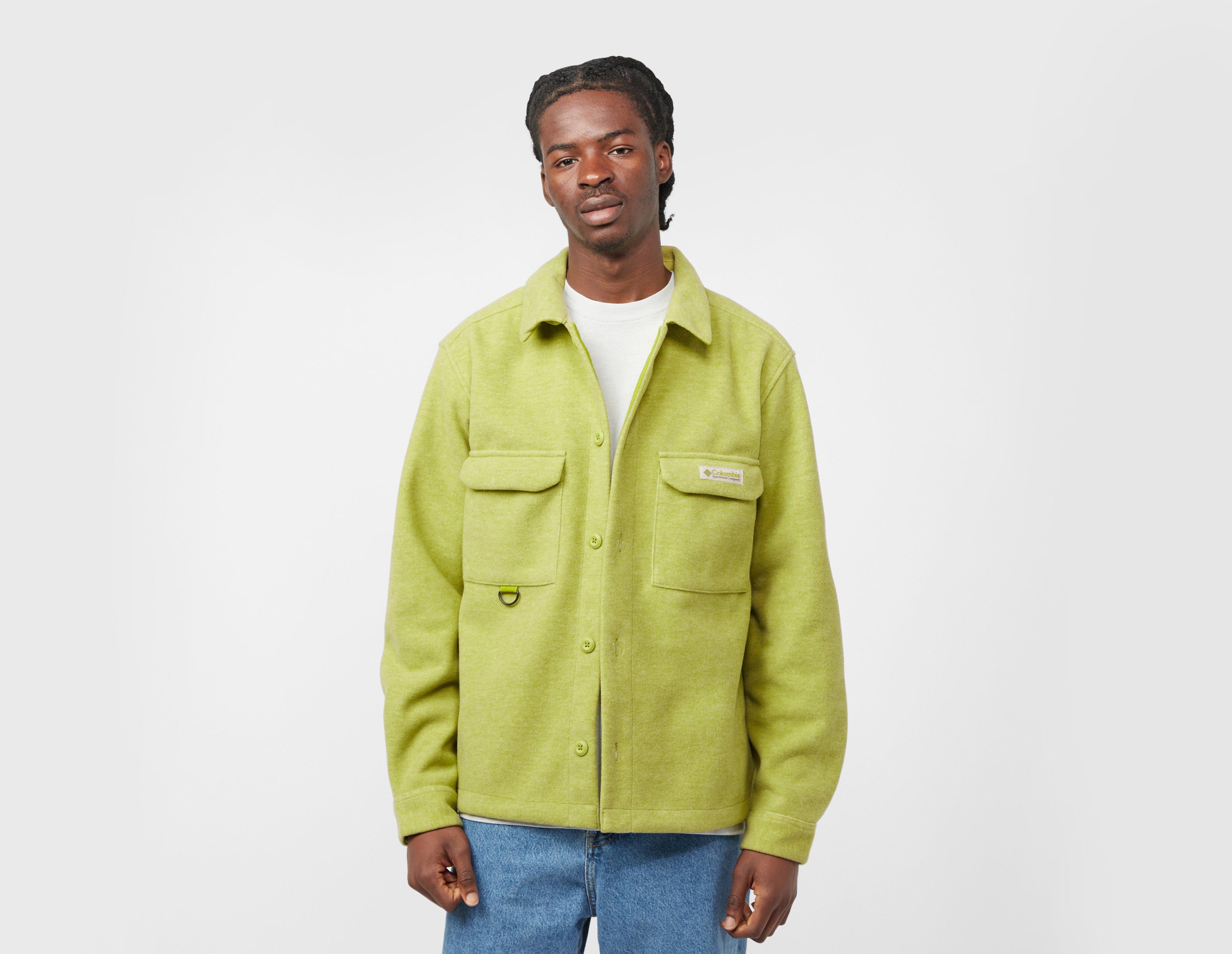 Columbia's unisex Wollowa Shirt Jacket in a seasonal 'Phython Green' takes inspiration from outdoor heritage and adds a contemporary twist. Snap-closure chest pockets sit at the chest with a D-ring detail on the right side and woven tag branding on the left. Perfect. | our model is 6'2" and wears a size medium