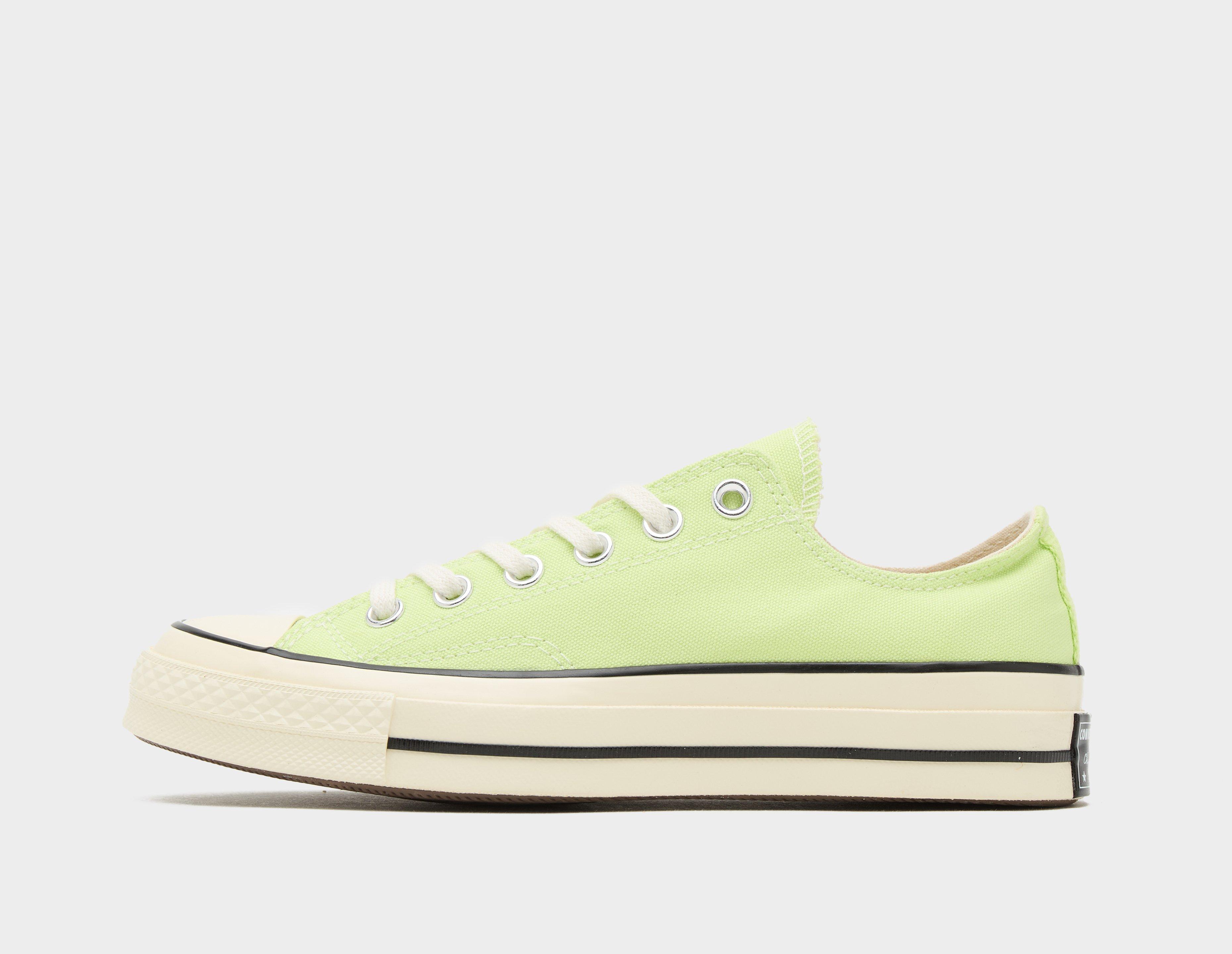 The Chuck 70 - a time-tested trend-setter. The 'Citron This Green' iteration calls back in its low-top trusty canvas upper, hosting tonal stitching through-out alongside a rubberised toe cap for some durable reinforcement. Underfoot, a vulcanised sole with black sidewall stripes and OrthoLite cushioning keeps it comfortable, while license plate branding on the heel cap gleams with Converse heritage. | A07431C