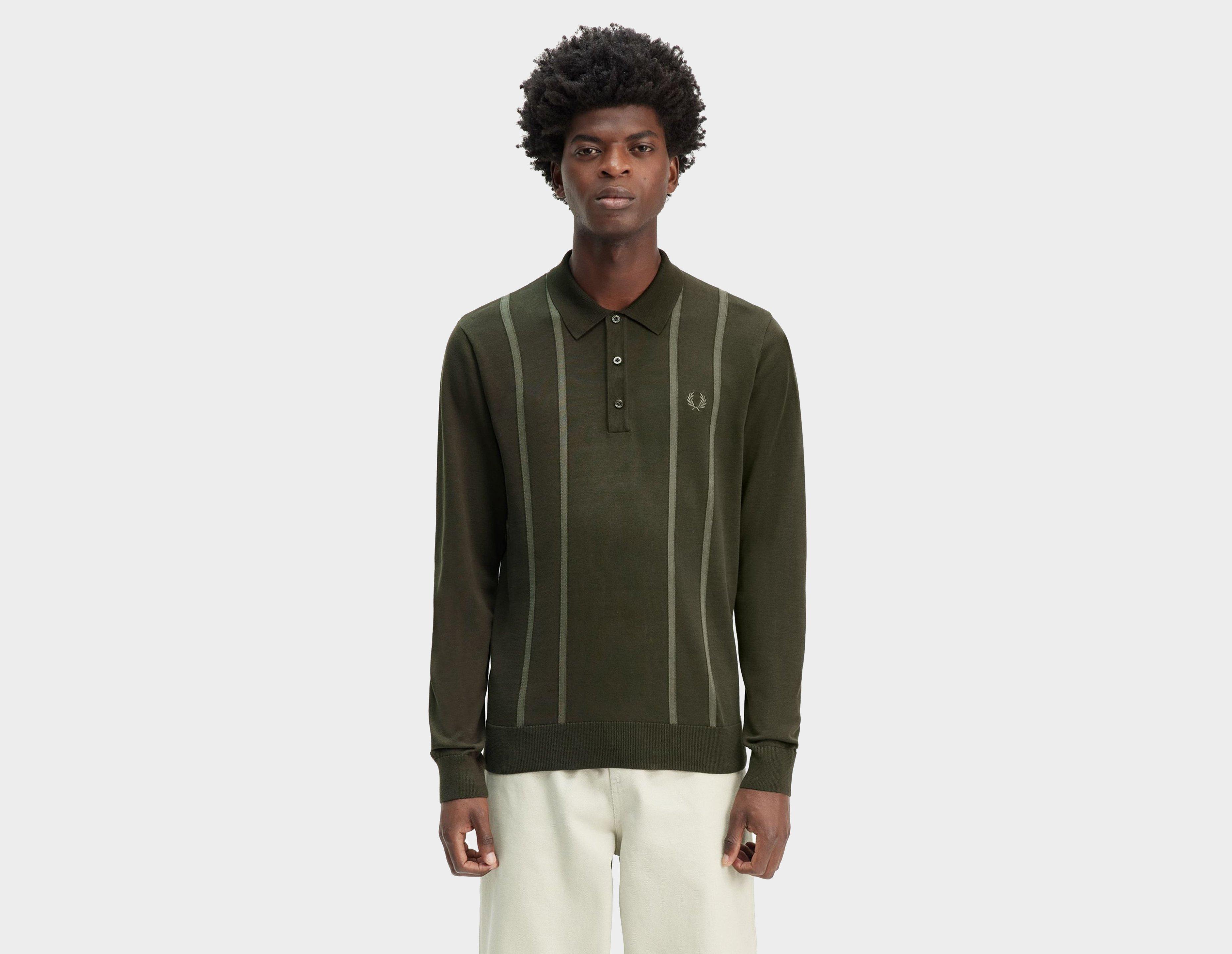 The Fred Vertical Stripe Knit is a textured layer that's crafted purely from 'Night Green' lambswool. Laurel Wreath embroidery appears on the upper left chest; business as usual by the British brand. | our model is 6'2'' and wears a size medium