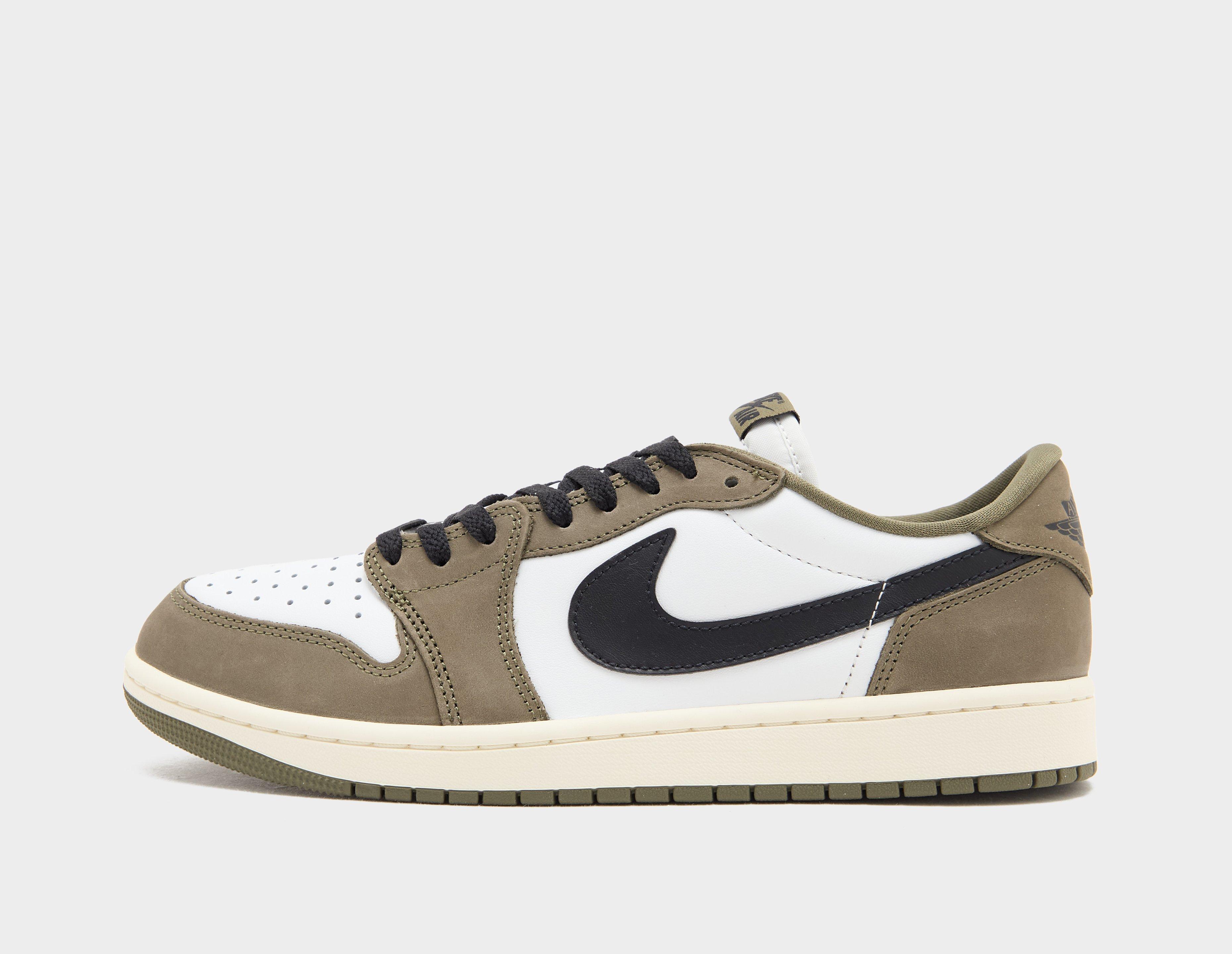 Following in the footsteps of like-minded Travis Scott releases that have lit up the streetwear landscape in recent memory, Air Jordan's 1 Retro Low OG 'Medium Olive' is a muted take that mimics the iconic 'Chicago' colour blocking. The upper opts for a premium 'Summit White' leather base with 'Medium Olive' suede overlays and a traditional perforated toe box. Contrast oversized Swoosh insignias radiate Beaverton heritage from the sidewalls, while embossed Wings are etched across the heels and woven Nike Air labels adorn the tongue. Underfoot, Nike Air cushioning provides responsive comfort from the lightweight foam midsole and rubber outsoles with hoops pivot circle traction provide grip originally engineered for the basketball court. | HQ6998-200