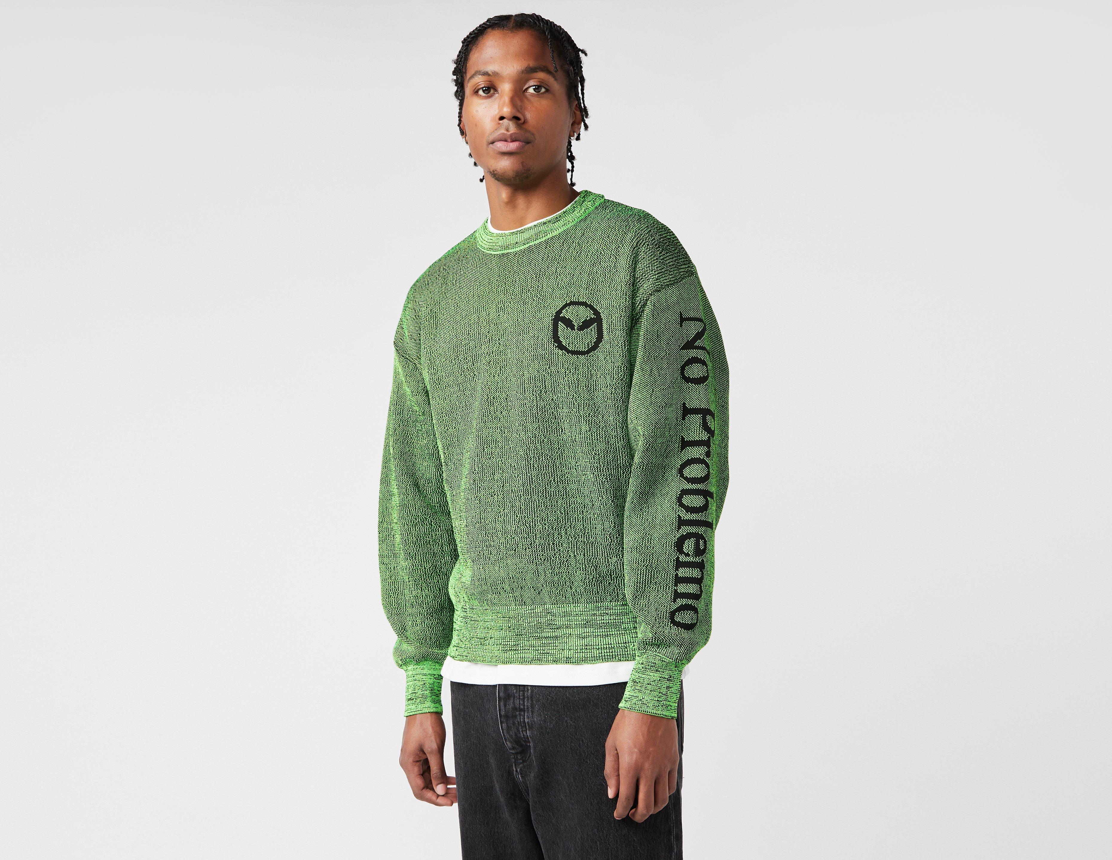 Knitwear the No Problemo way, the Glitch Alien-O Sweatshirt will be your go-to this season. Arriving in a green hue, the pullover features branding down the sleeve and a signature alien motif on the chest. | our model is 6'2" and wears a size medium