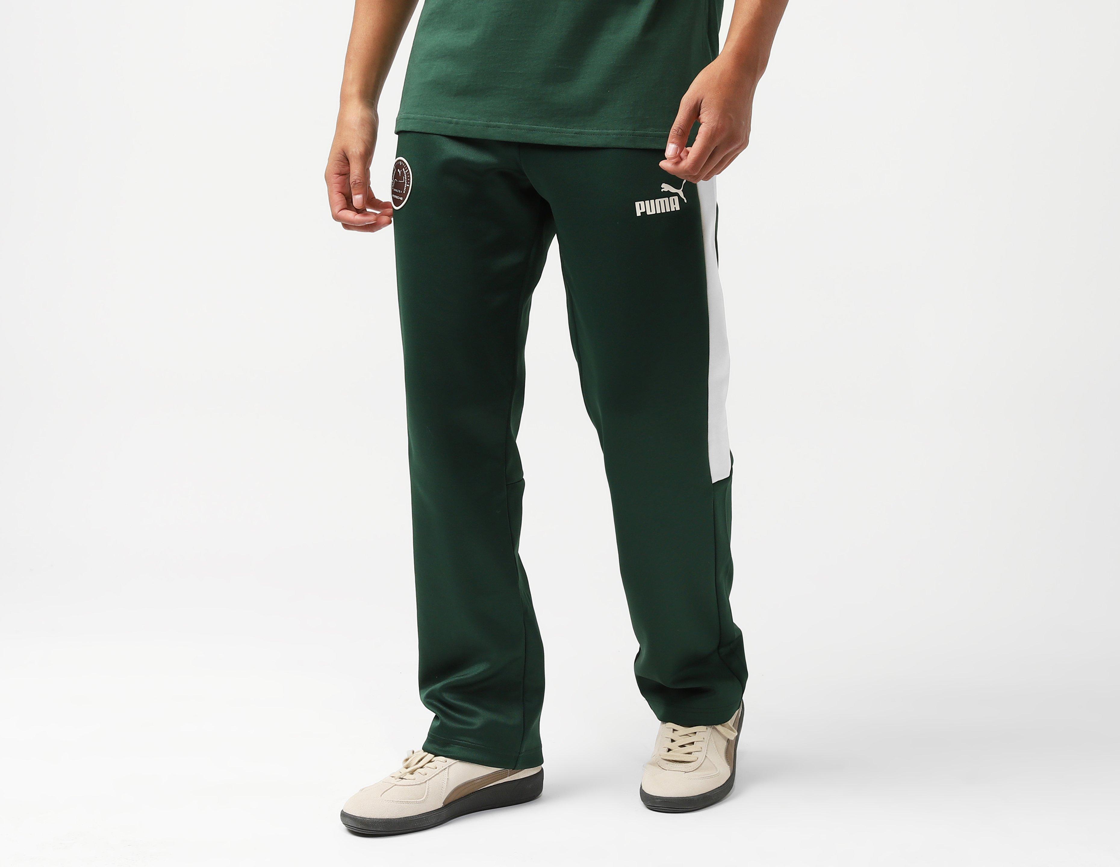 The PUMA x Porsche MT7 Track Pants are inspired by classic Porsche racing, with graphics similar to the iconic Porsche 911 rally car, including a clever touch with Porsche's logo in the form of a car speedometer. The logo contains Google map diagrams of both Porsche and PUMA HQs, showcasing the closeness between the two German powerhouse brands from Herzogenaurach to Stuttgart. Rich green coats the pair with contrast panelling, while a soft poly build and elastic waist confirm comfort.