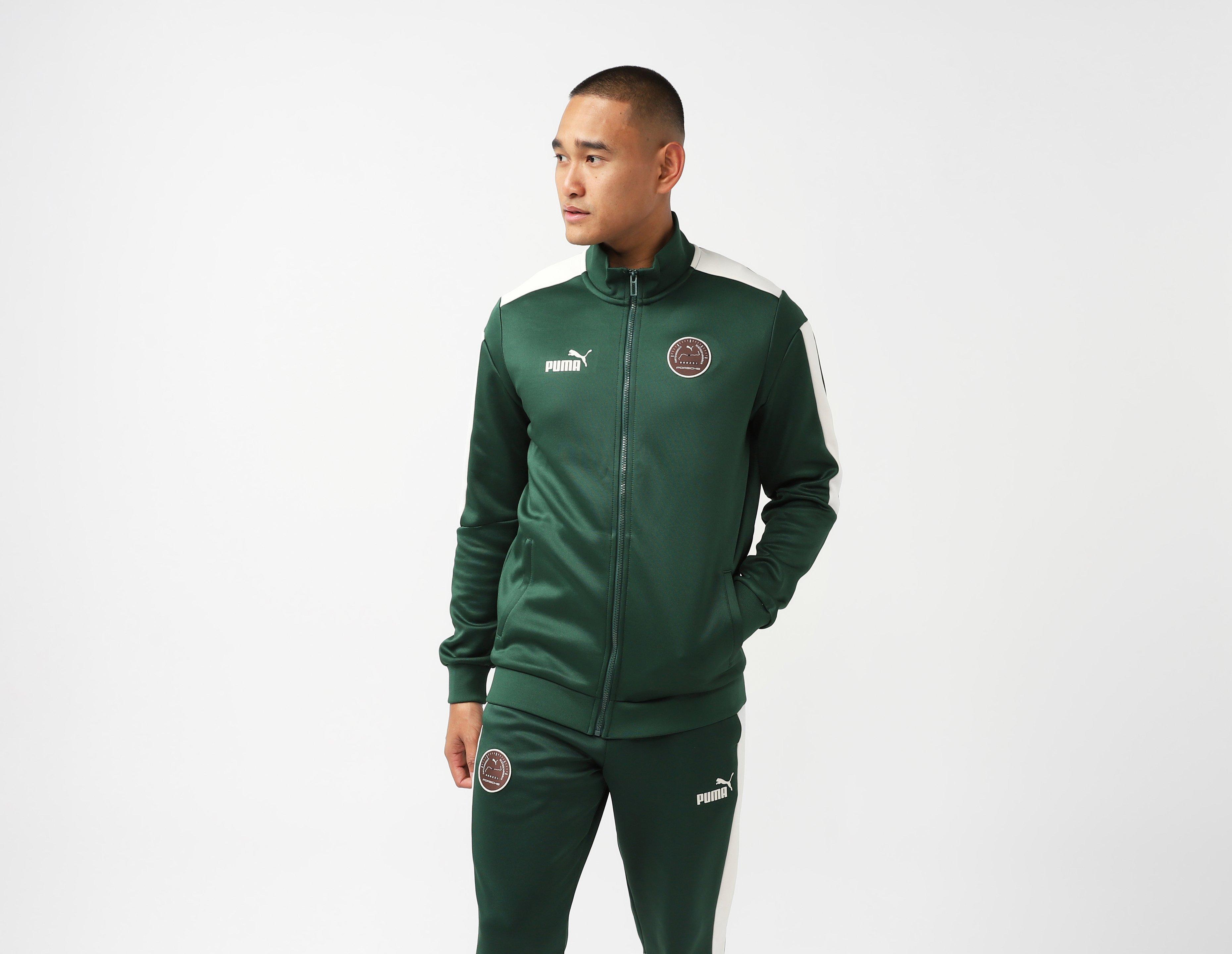 The PUMA x Porsche MT7 Track Top is inspired by classic Porsche racing, with graphics similar to the iconic Porsche 911 rally car. The logo contains Google map diagrams of both Porsche and PUMA HQs, showcasing the closeness between the two German powerhouse brands from Herzogenaurach to Stuttgart. Rich green coats the track top with contrast panelling and co-branded hits completing the design.