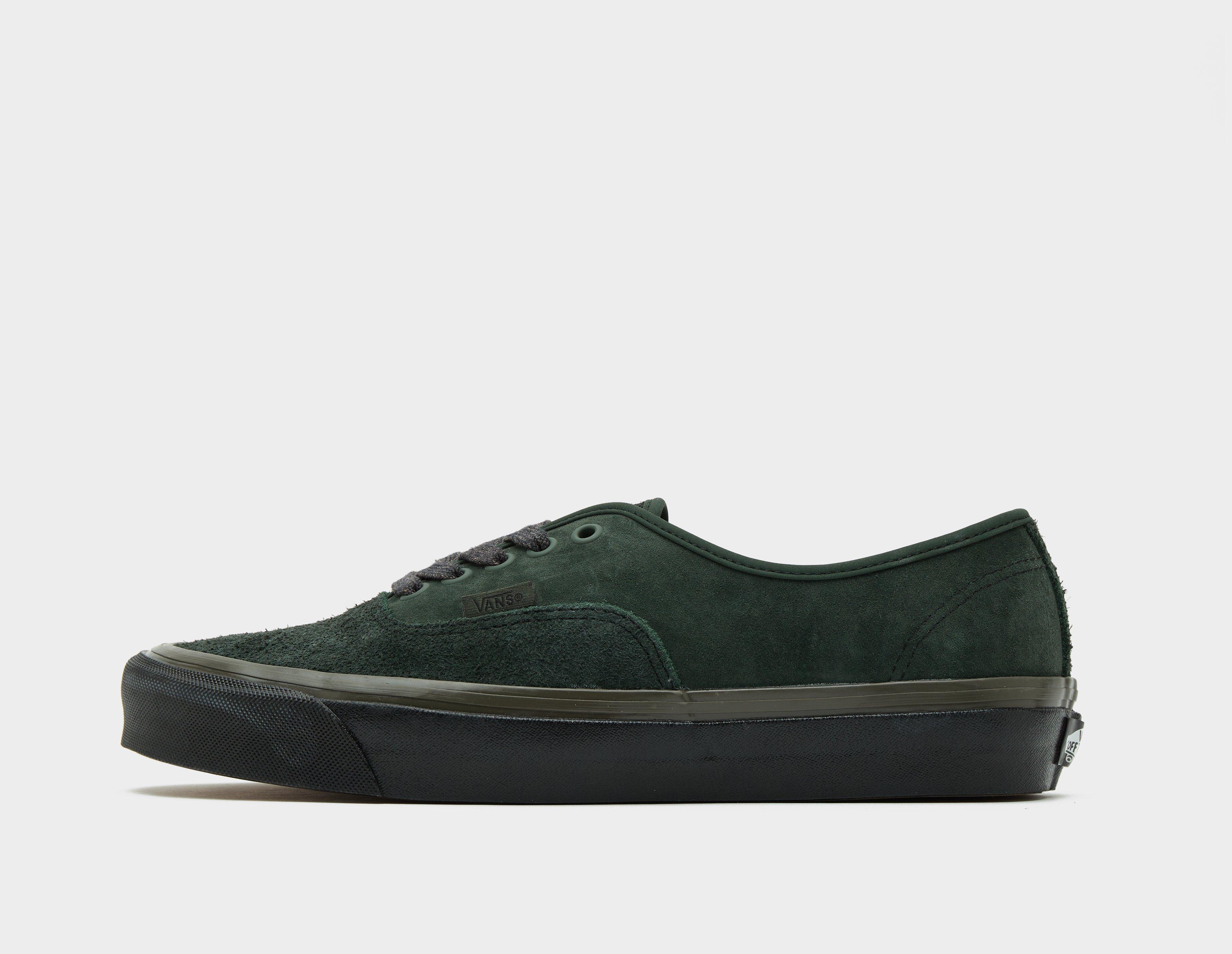 For our second instalment of the Vans 'By size?' pack, we've dressed the Authentic buttery suede and hairy suede adding textural variety to the design. Stripping back the story element, we wanted this pair to be an easy, everyday shoe to reach for throughout Autumn Winter. Fitted with a seasonally apt rich green hue, it rests atop a cushioned Waffle sole unit with signature license plate branding. | VN0005U8FGN