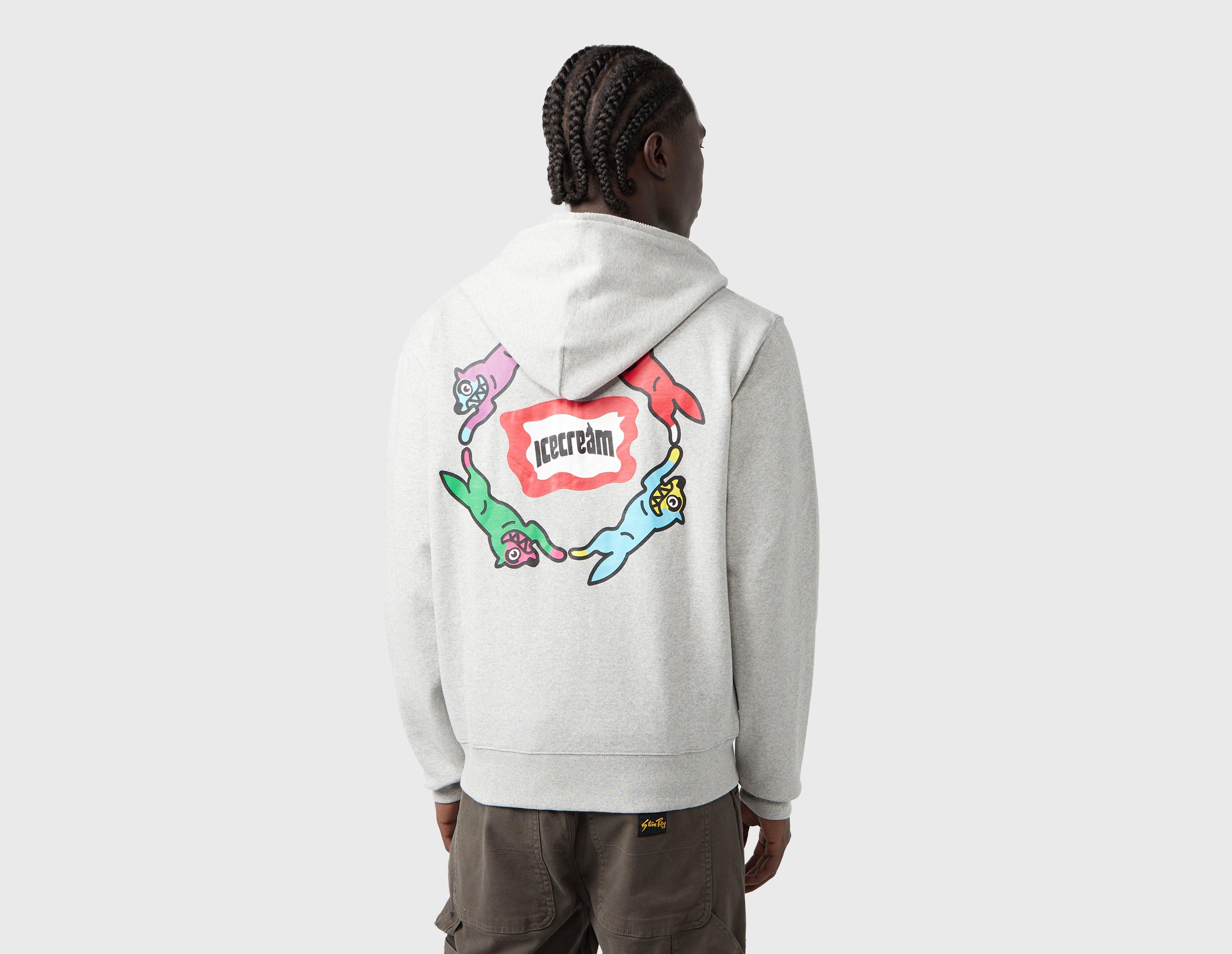 ICECREAM's Roundabout Zip Hoodie in 'Heather Grey' is composed of fleecy cotton and houses a kangaroo pocket and ribbed trims. A screen print Running Dog graphic canvases the back, while signet embroidery embellishes the cuff. | our model is 6'2'' and wears a size medium