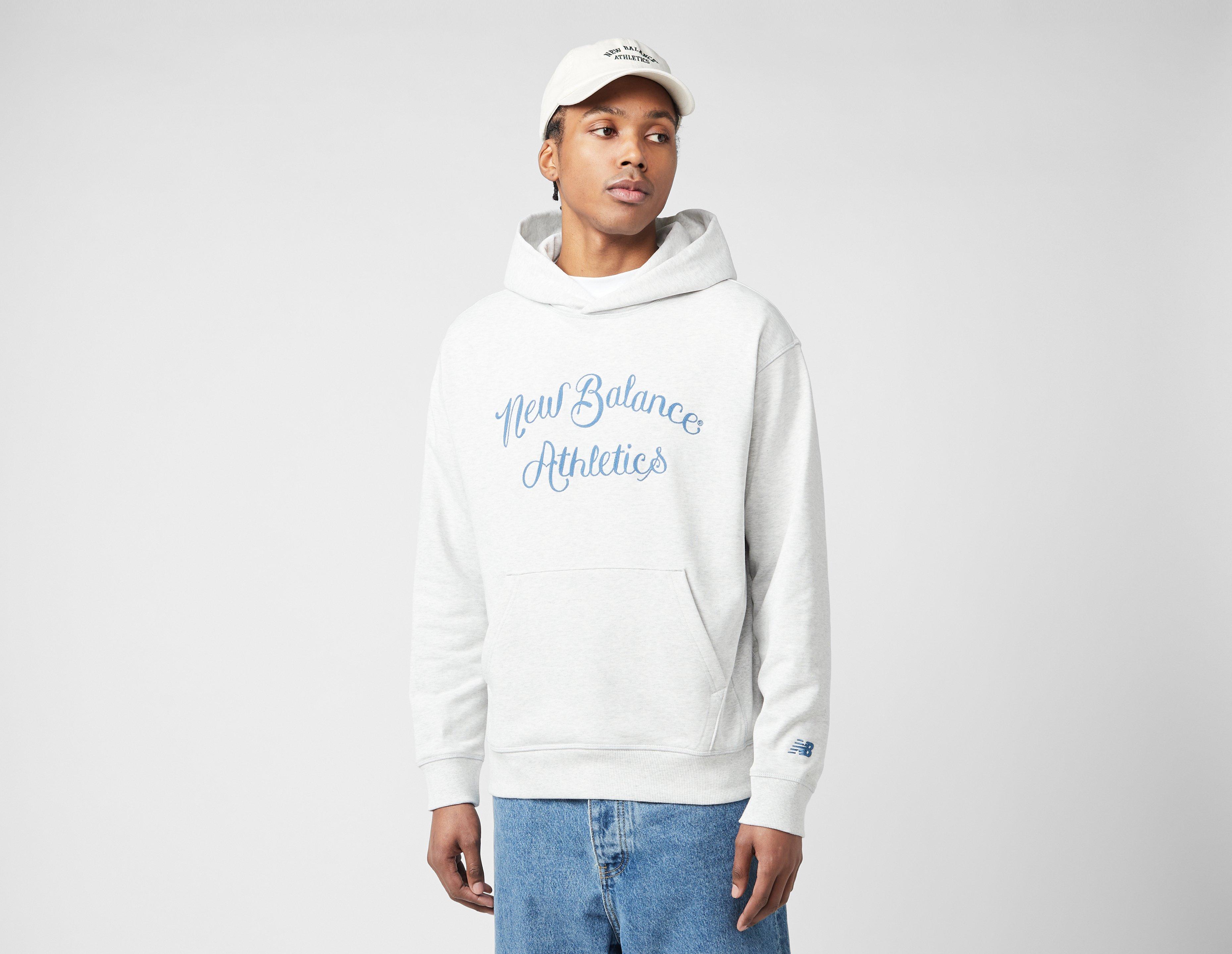 Renowned for quality, New Balance never fails to deliver - this Athletics Hoodie is crafted from premium grey cotton and adorned with embroidered script branding to confirm heritage. | MT51935AHH | our model is 6'2" and wears a size medium