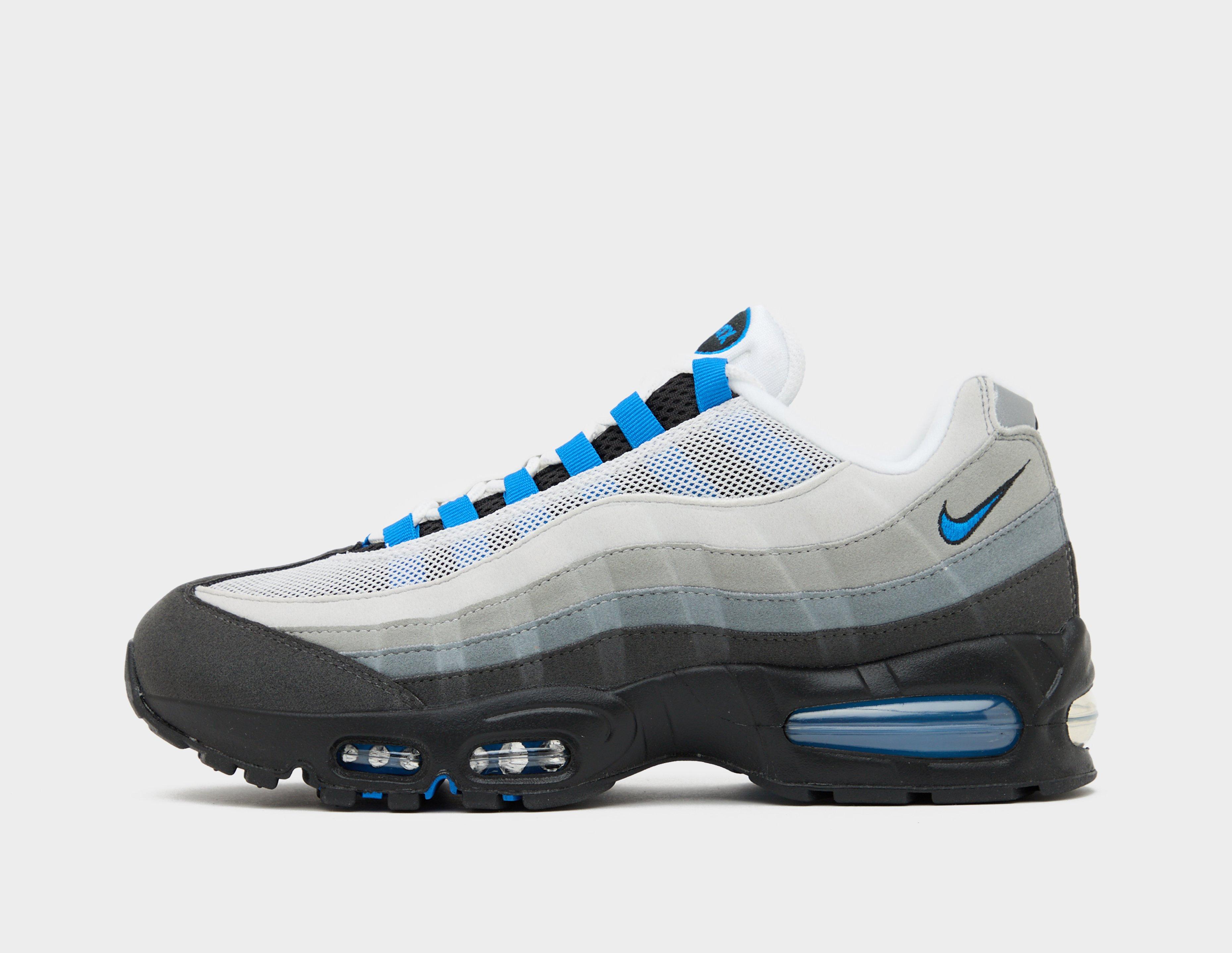 The Nike Air Max 95 OG 'Blue Spark' is constructed from a flexible white mesh upper with layered synthetic suede tooling inspired by human anatomy and heel encompassing cushioned collars. Underfoot, 'Big Bubble' Air Units provide unrivalled responsivity and shock absorption, whereas two-tone Waffle rubber outsoles offer up versatile grip on concrete, grass - you name it. | IM7410-100