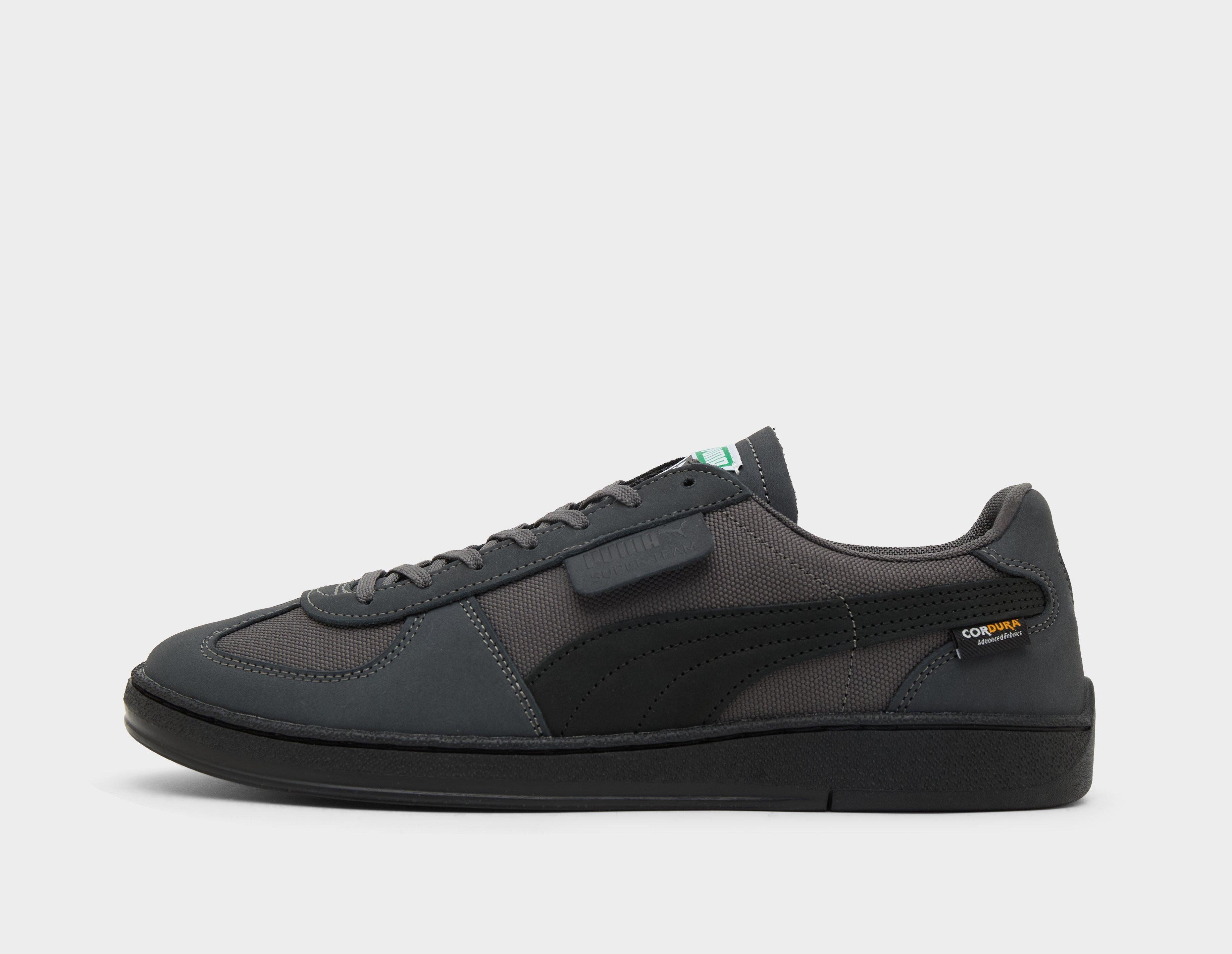 After debuting with the German handball team, the silhouette soon entered '80s terrace culture. PUMA reimagines the original Super Team with a weather-proof Cordura base in a deep grey hue, overlaid with tonal suede panels. A gum rubber sole unit draws a line under the design, and a darkened Formstrip confirms heritage on the sidewall. | 403173_02