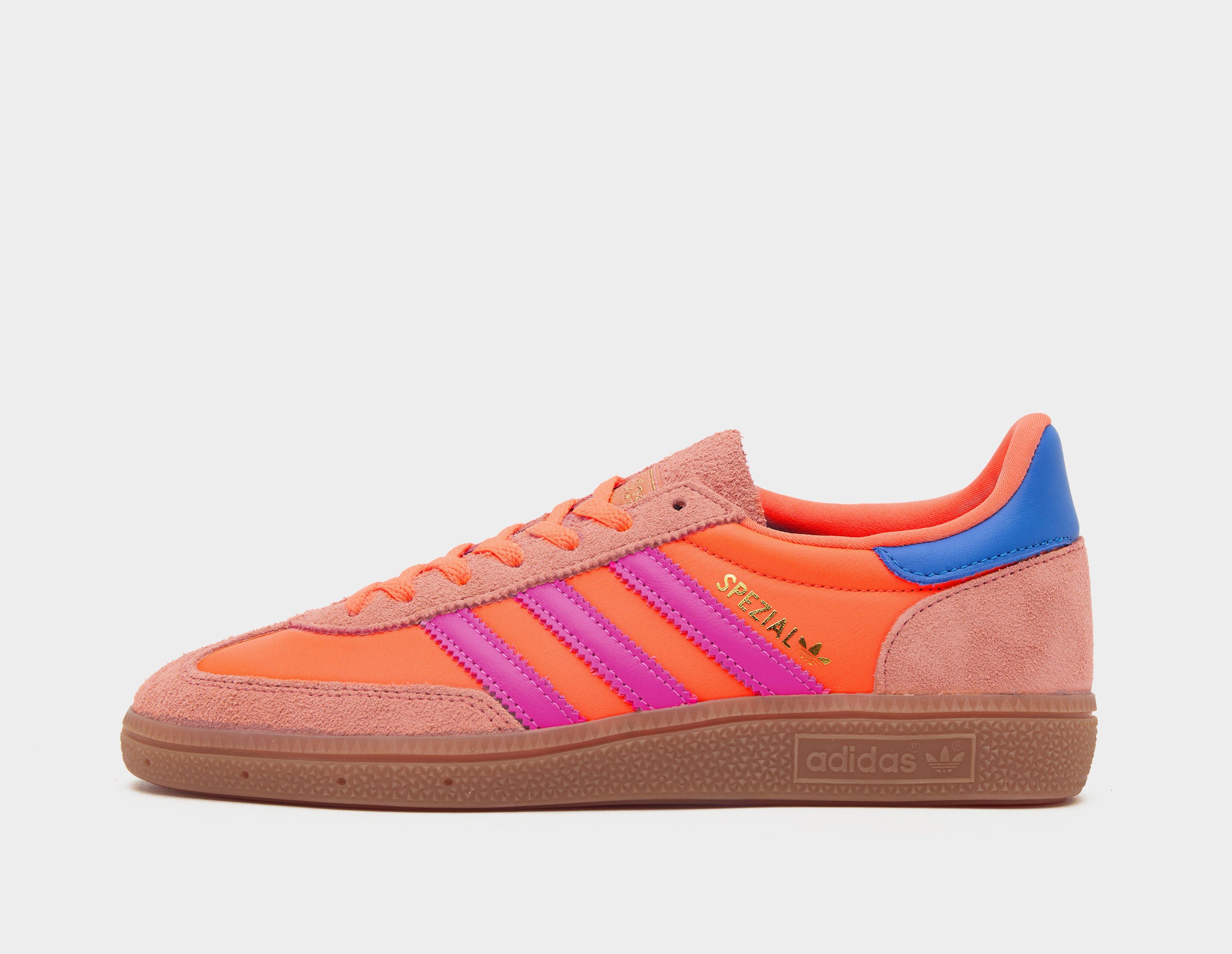 Upgraded for the new season, adidas' iconic Handball Spezial returns in a new satin outfit. Painted in bright summer hues of 'Solar Orange' and 'Lucid Pink', the upper is built from smooth satin with luxe suede overlays and leather detailing. Underfoot, a classic gum rubber sole unit finalises the design. | JH5659