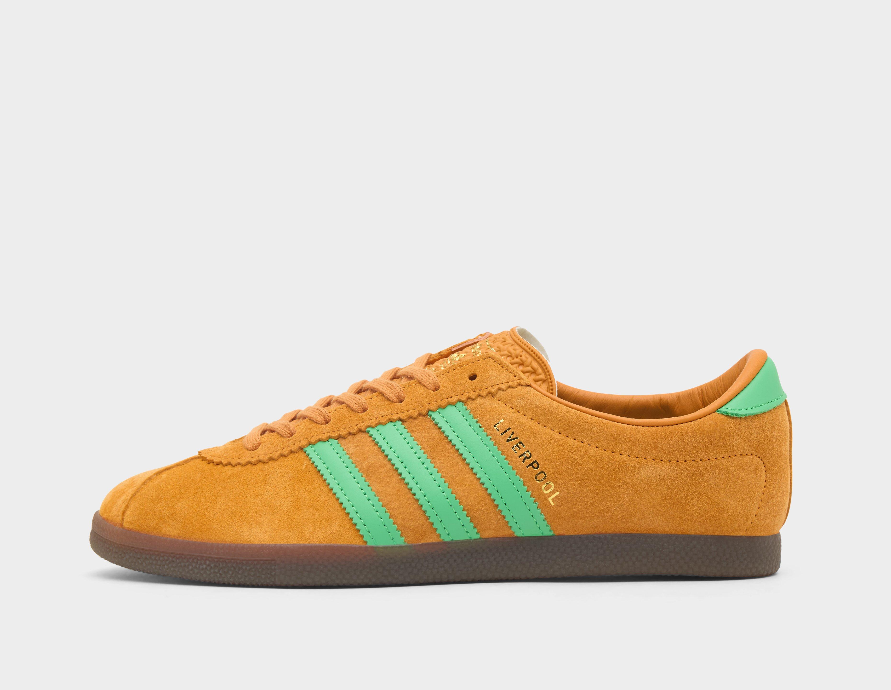 In 2020, adidas and size? officially made history with the first-ever Liverpool model. 5 years on, we return to overhaul the treasured model. Drenched in an orange suede with green sticking to the 3-Stripes and heel tabs, a combination full of identity and character, just like the city itself. Crinkle tongues remain true to 'City Series' classics, and 'Liverpool' lettering shines on the sidewalls. Anniversary footbeds and gum soles run under the pair, while '1/2025' inscribes the heels, marking this rare release. | JS1353