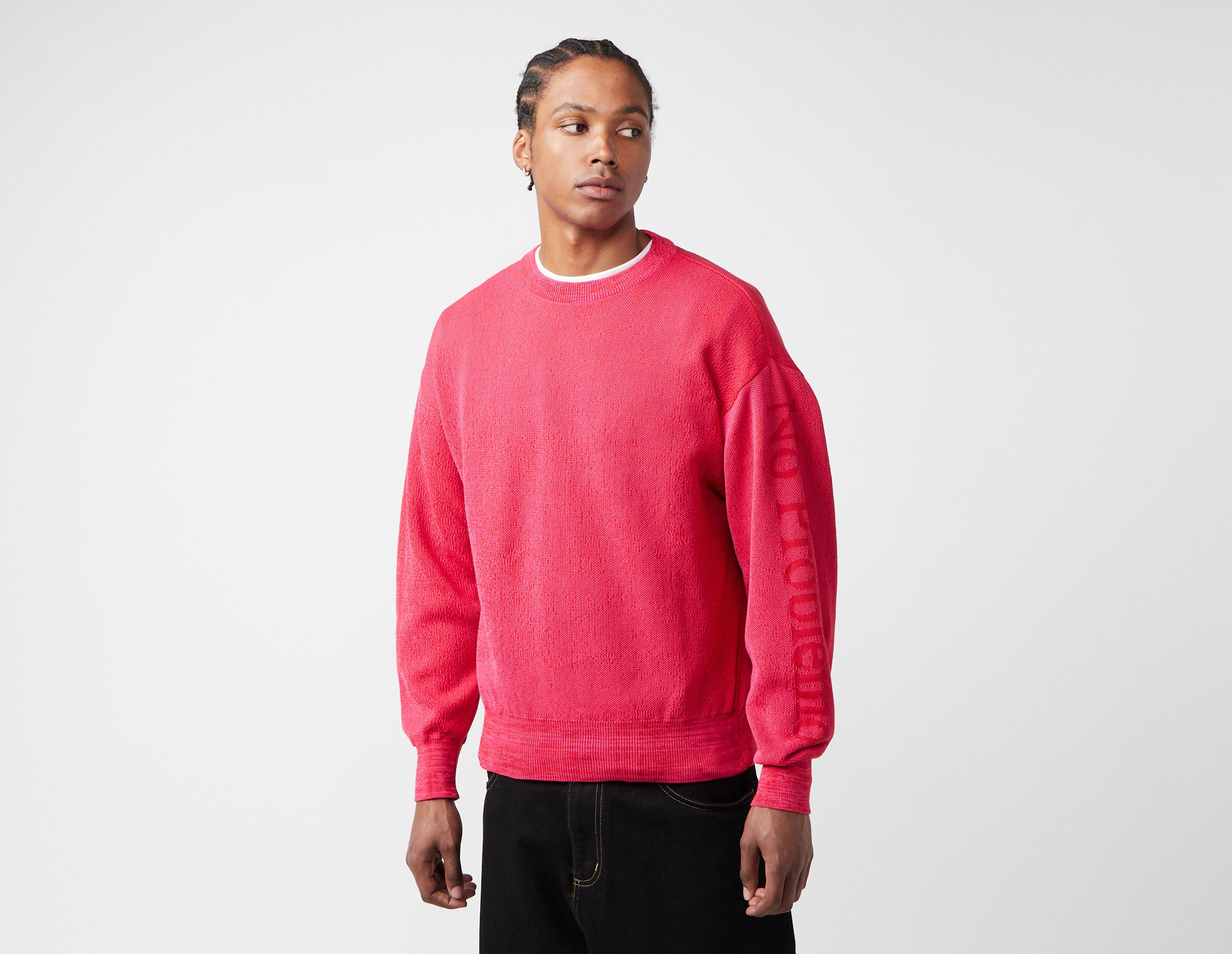 Knitwear the No Problemo way, the Glitch Crew Neck Knit Jumper is crafted from organic cotton and fluro recycled yarn. Featuring jacquard sleeve branding, this pink pullover will quickly become a go-to. | our model is 6'2" and wears a size medium