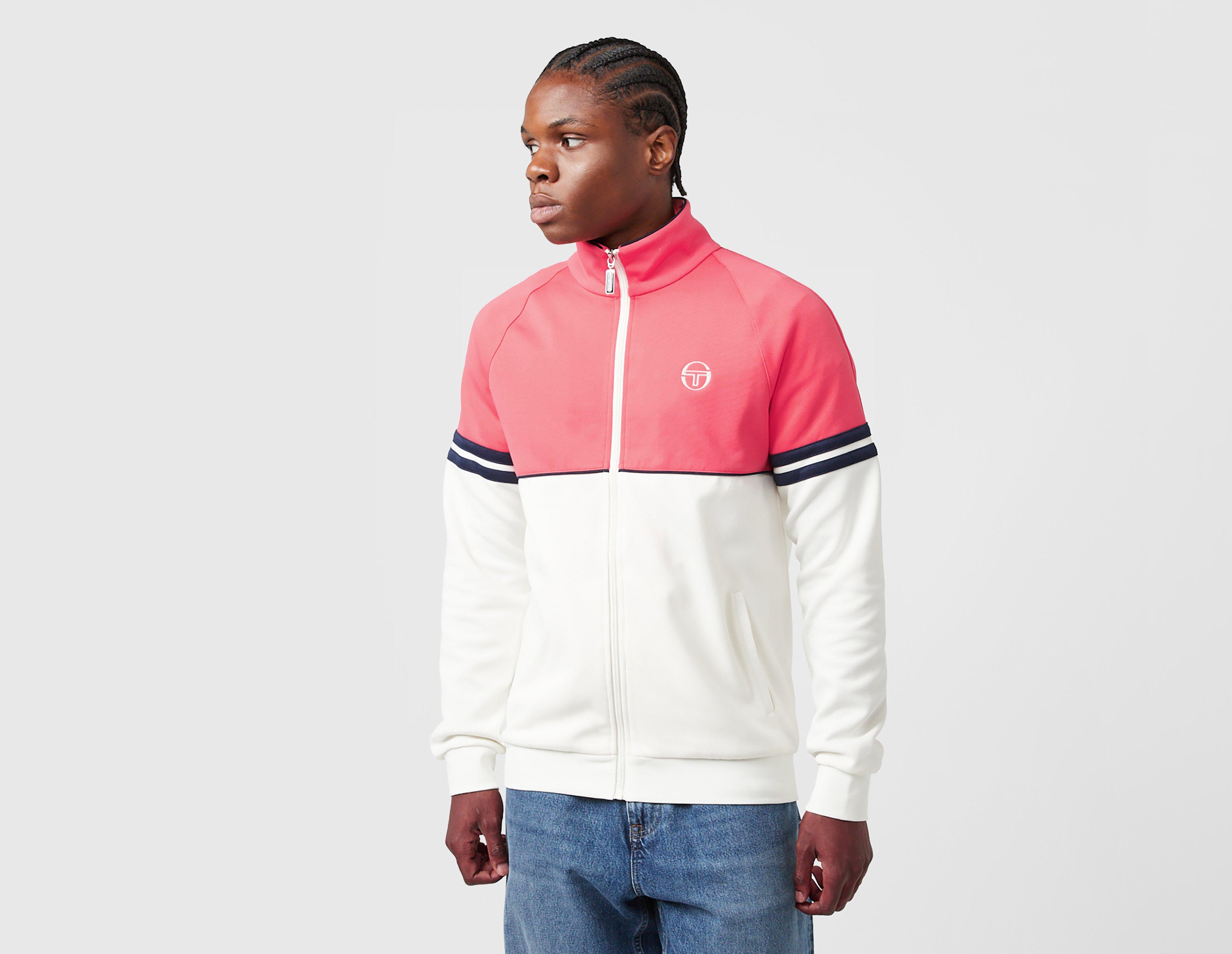 Terrace heritage in action, the Sergio Tacchini Orion Track Top is a retro sporting piece that offers streetwear expression. A full central zip makes it nicely adjustable, while contrast piping complements the 'Salmon' and 'Ecru' finish. The poly cotton fabric is soft, light and stretchy, plus cuffs keep things snug. | our model is 6'0.5" and wears a size medium