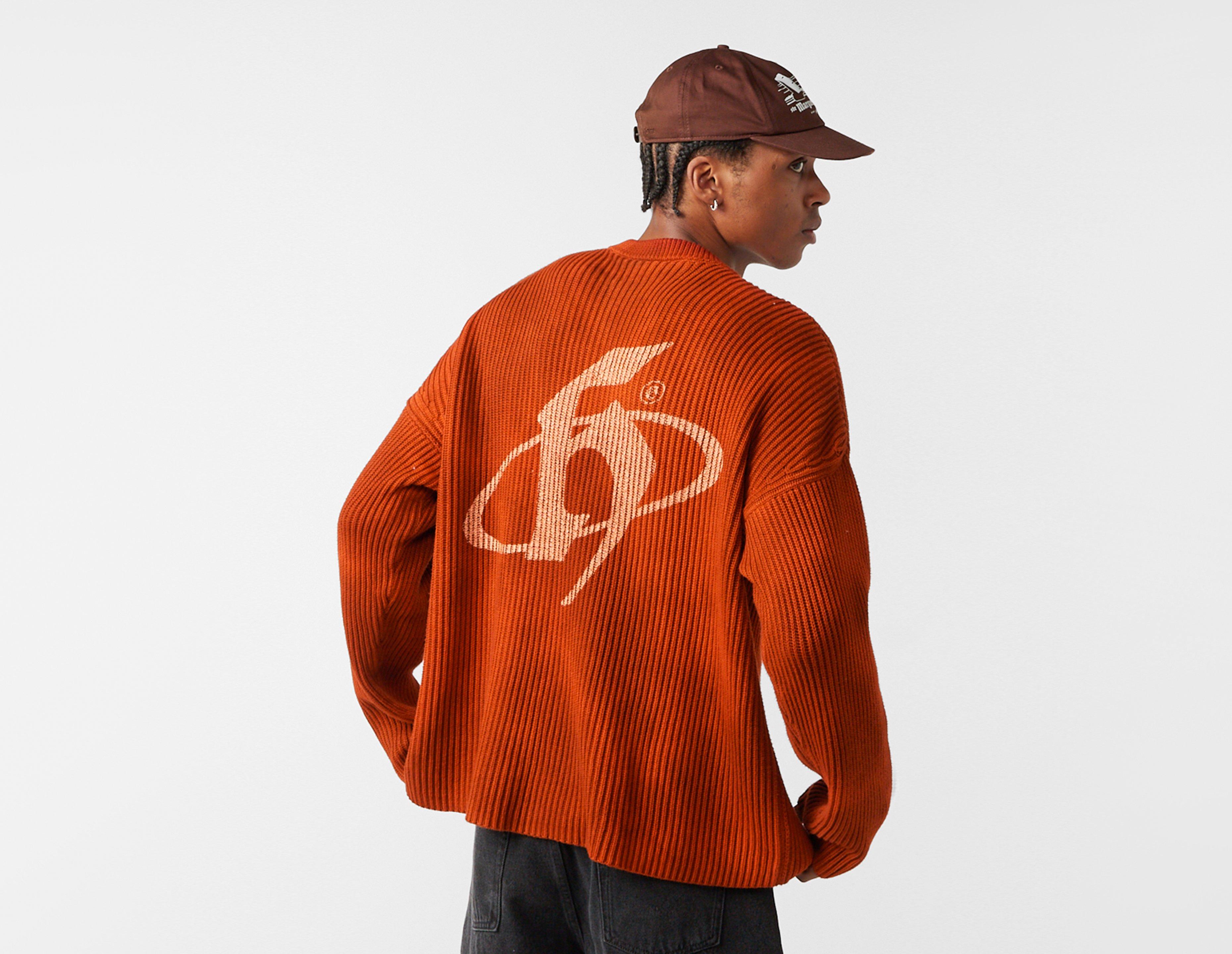 Home Grown's Halo Crew Knit in red is a textured recipe that's cut to a cropped fit. Motif embroidery adorns the chest and is mirrored in print on the reverse. | our model is 6'2'' and wears a size medium