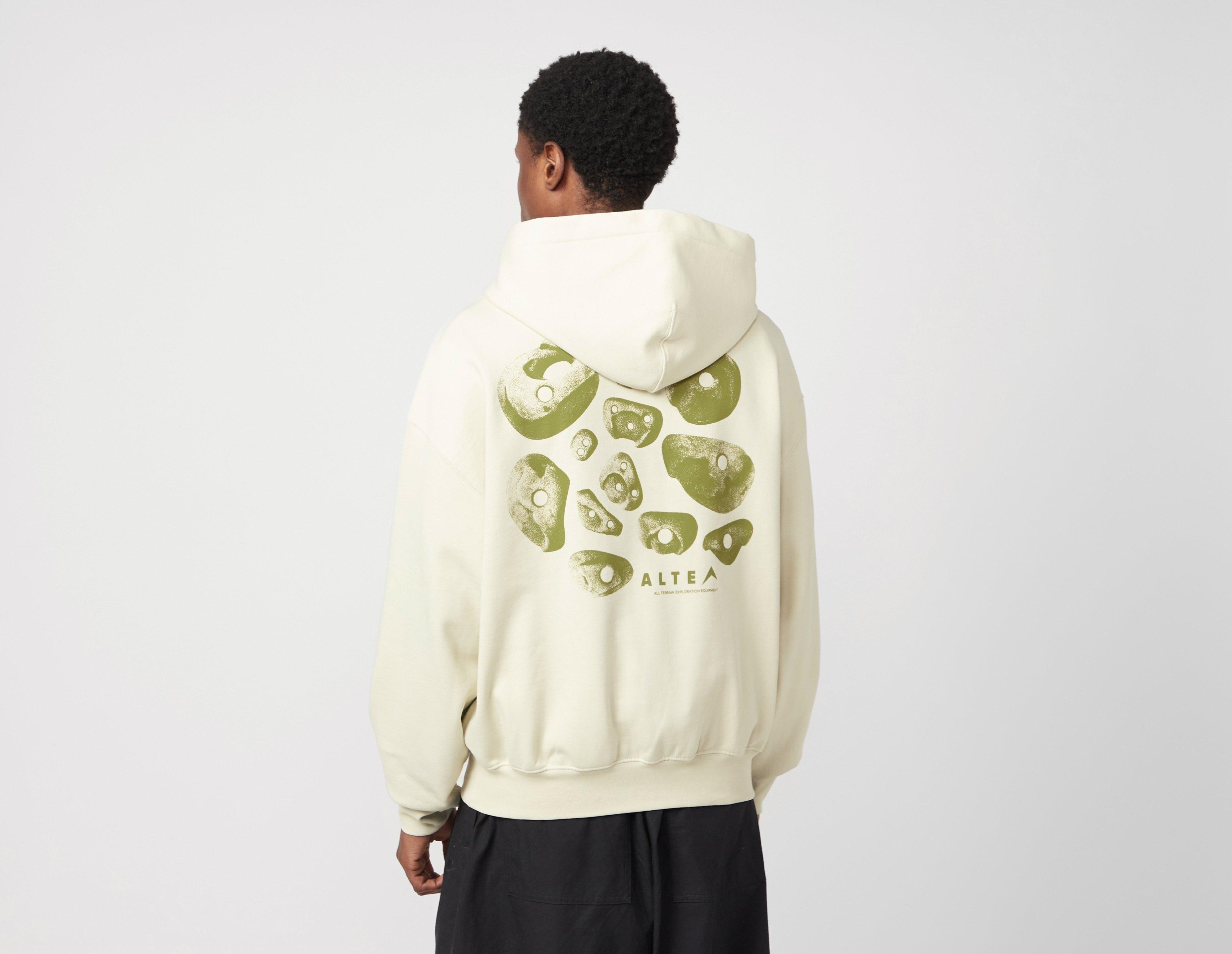 An antidote to the rigid world of active performance, ALTE blends style, functionality and aesthetics, adapting to your lifestyle. Cut and finished with a contemporary take the heavyweight Grip Hoodie in cream has a boxy fit with a green graphic print on the back. | our model is 6'2" and wears a size medium