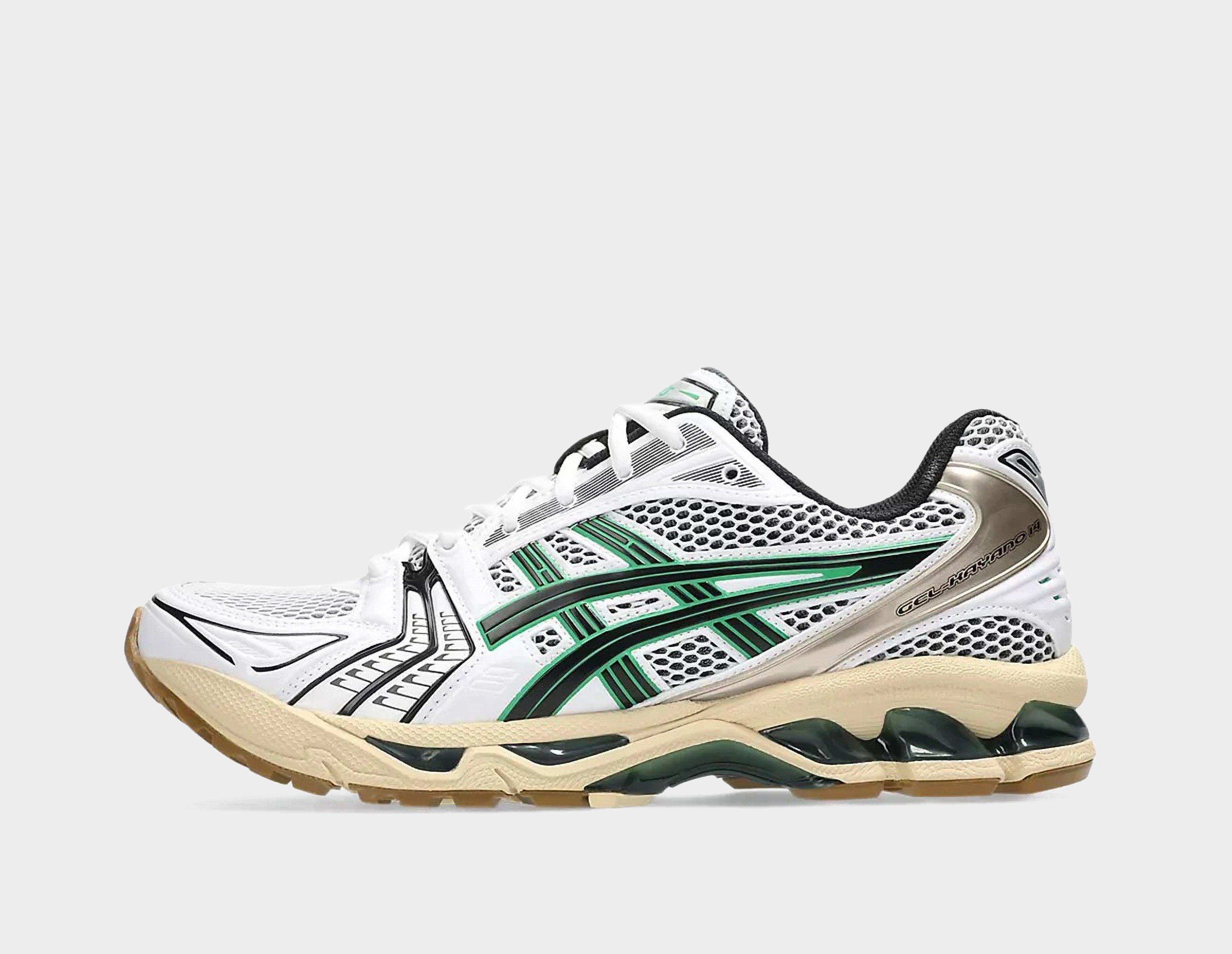 The ASICS GEL-KAYANO 14 is one of the label's most lauded silhouettes, the uppers of this white and 'Hinoki Beige' runner are enhanced with breathable mesh with sturdy synthetic leather overlays and classic ASICS sidewall branding. The brand's renowned comfort is provided too, with cushioning GEL technology and a TRUSSTIC support unit for prolonged foot support. | 1203A740-103