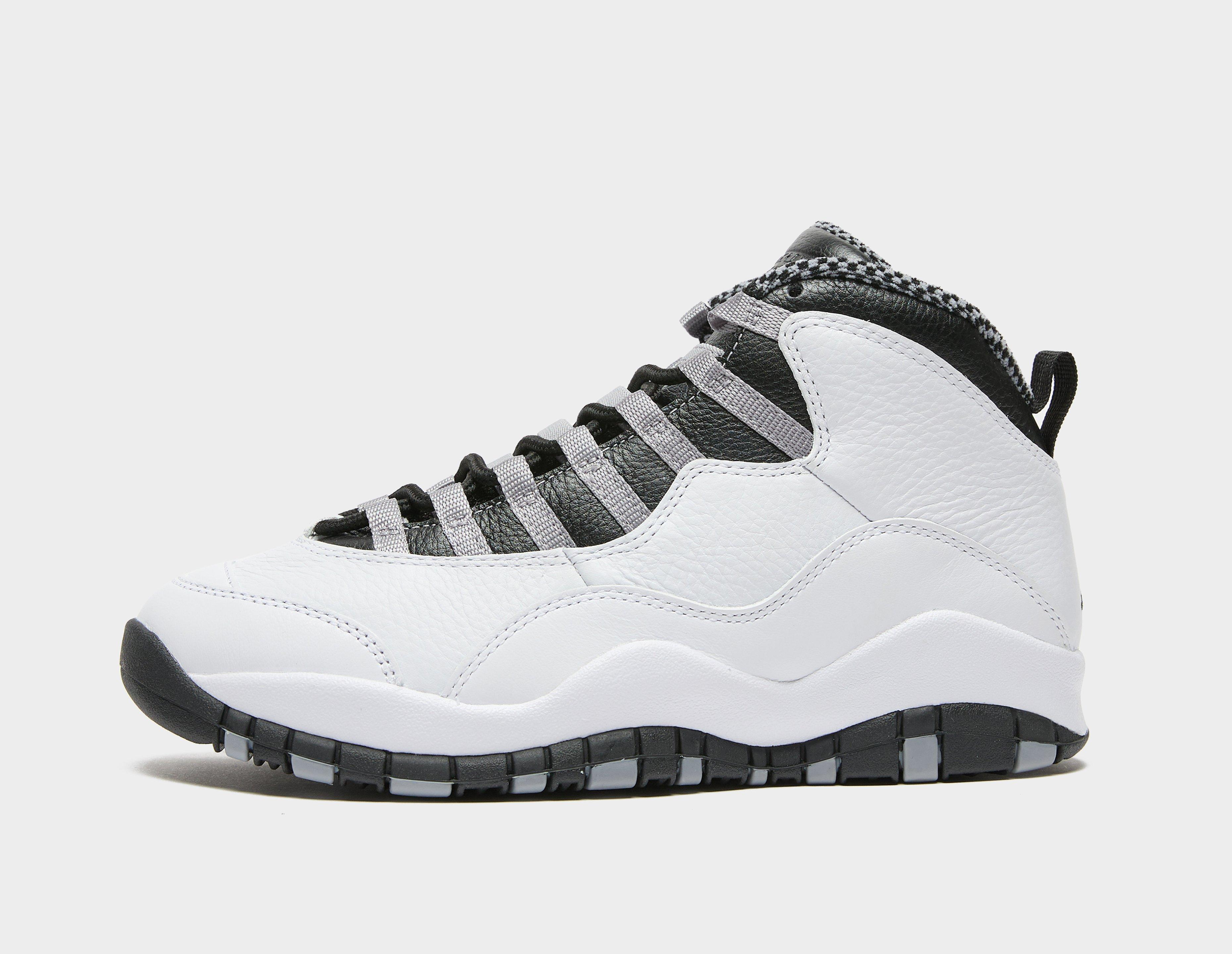 Last seen in 2013, Air Jordan's 10 Retro 'Steel' which MJ wore in the 1994 Scottie Pippen All Star Classic exhibition returns. The upper is constructed from tumbled leather with a wavy synthetic mudguard, chequered collar lining and handy heel pulls. Underfoot, phylon foam midsoles house full-length Nike Air cushioning, while rubber outsoles depict MJ's accolades and Jumpman embroidery etches off across the heels. | HJ6779-104