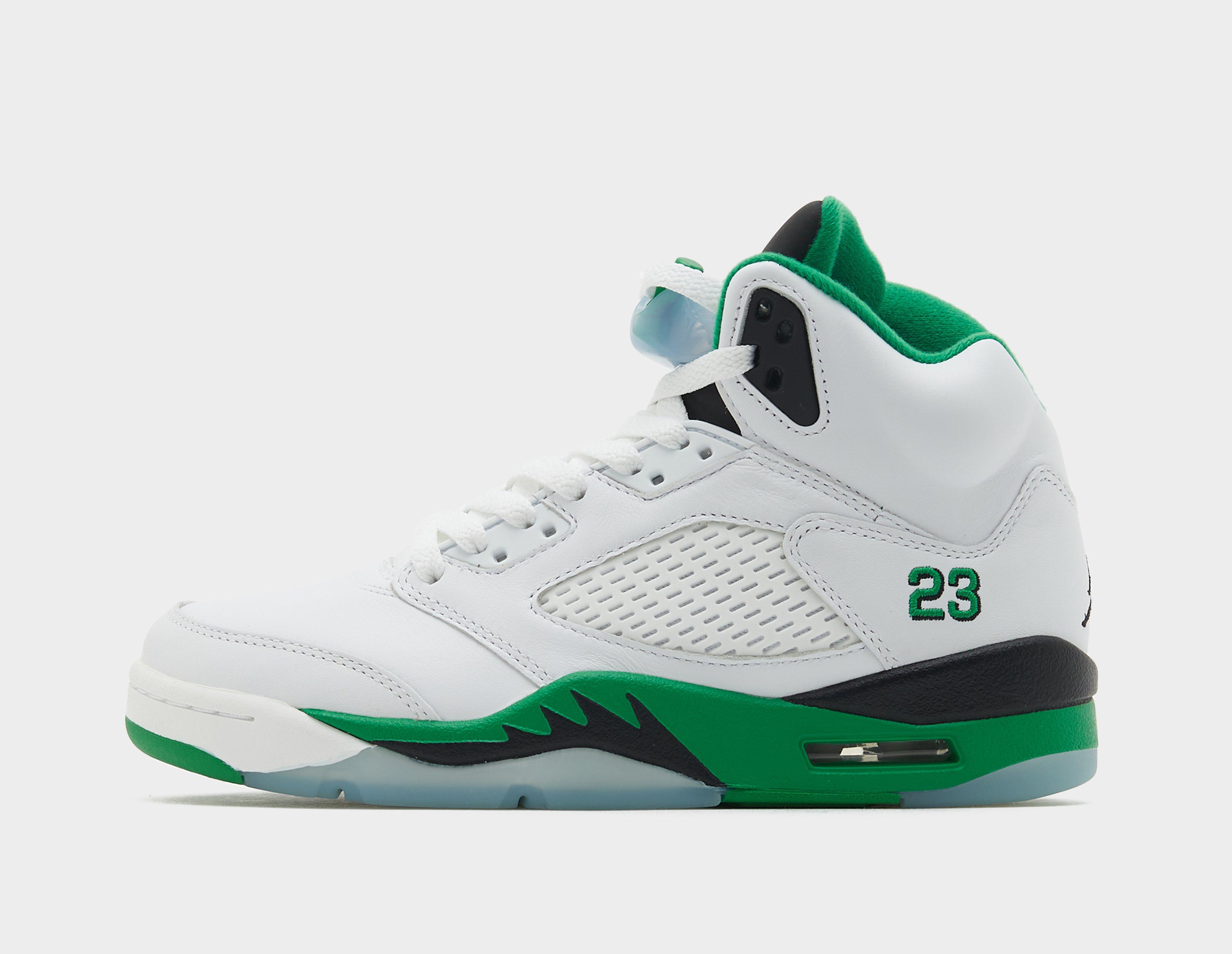 First introduced to the Jordan linage in 1990, the Air Jordan 5 was inspired by World War 2 fighter planes and was Tinker Hatfield's brainchild. Fast forward to today, the latest iteration adopts a 'Lucky Green' colourway with titular green accents throughout. A white hue dominates the leather uppers with tonal mesh sidewalls. A padded collar and tongue confirm comfiness up top while further down, a visible Air unit adds support and rubber coats the outsole, adding some much-needed grip. To finish, the Jumpman signals heritage on the tongue and heel. | DD9336-103