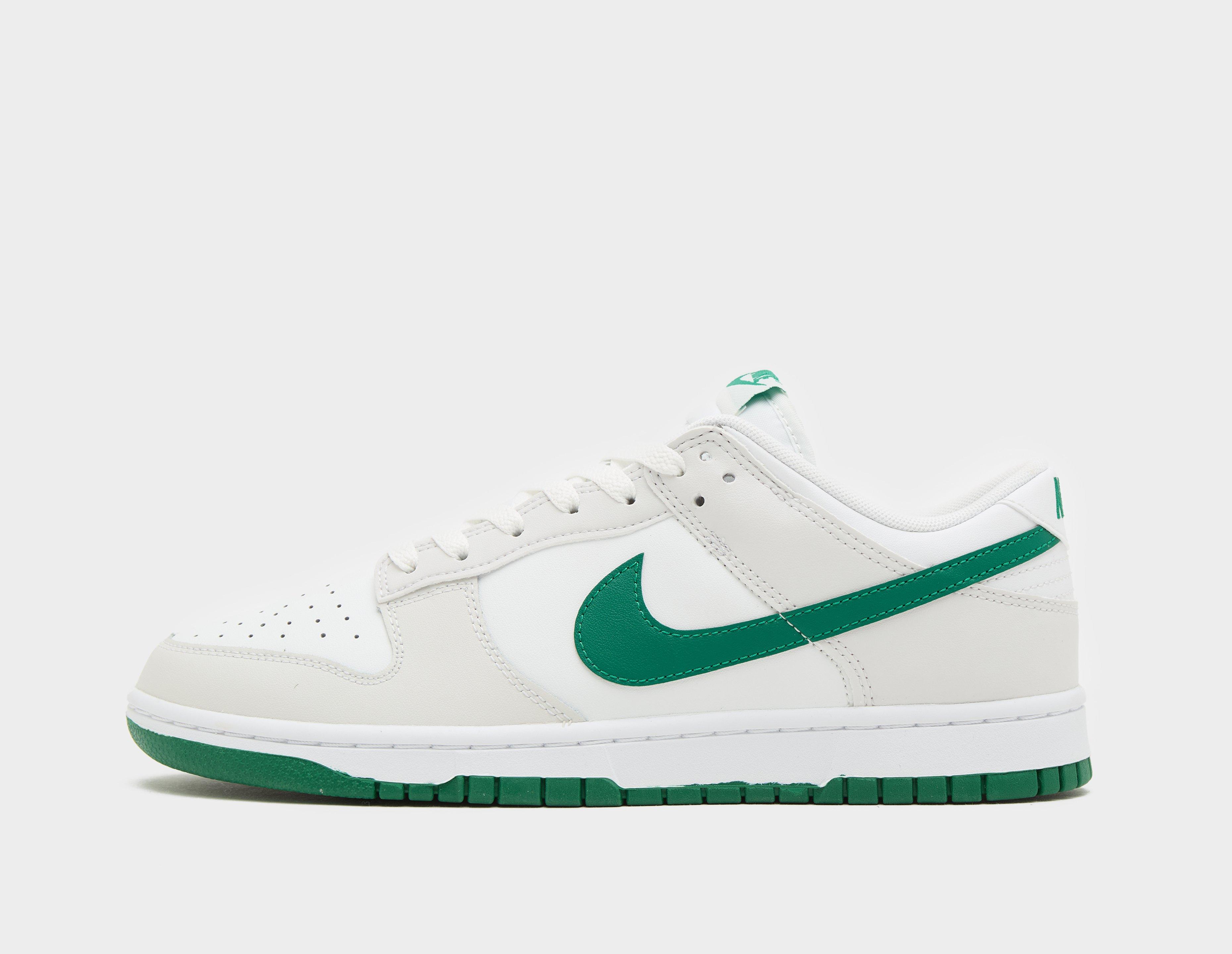 Iconic brainchild of Peter Moore - the Dunk Low - is serving up a vintage aesthetic in its 'Malachite' uniform. Premium white leather covers the base from the perforated toe box to the heel, while suede overlays coloured in 'Platinum Tint' keep it clean. Making a statement on the sidewall comes the Swoosh in 'Malachite' green, matching the grippy outsole, which adds board-ready traction underfoot. | DV0831-107