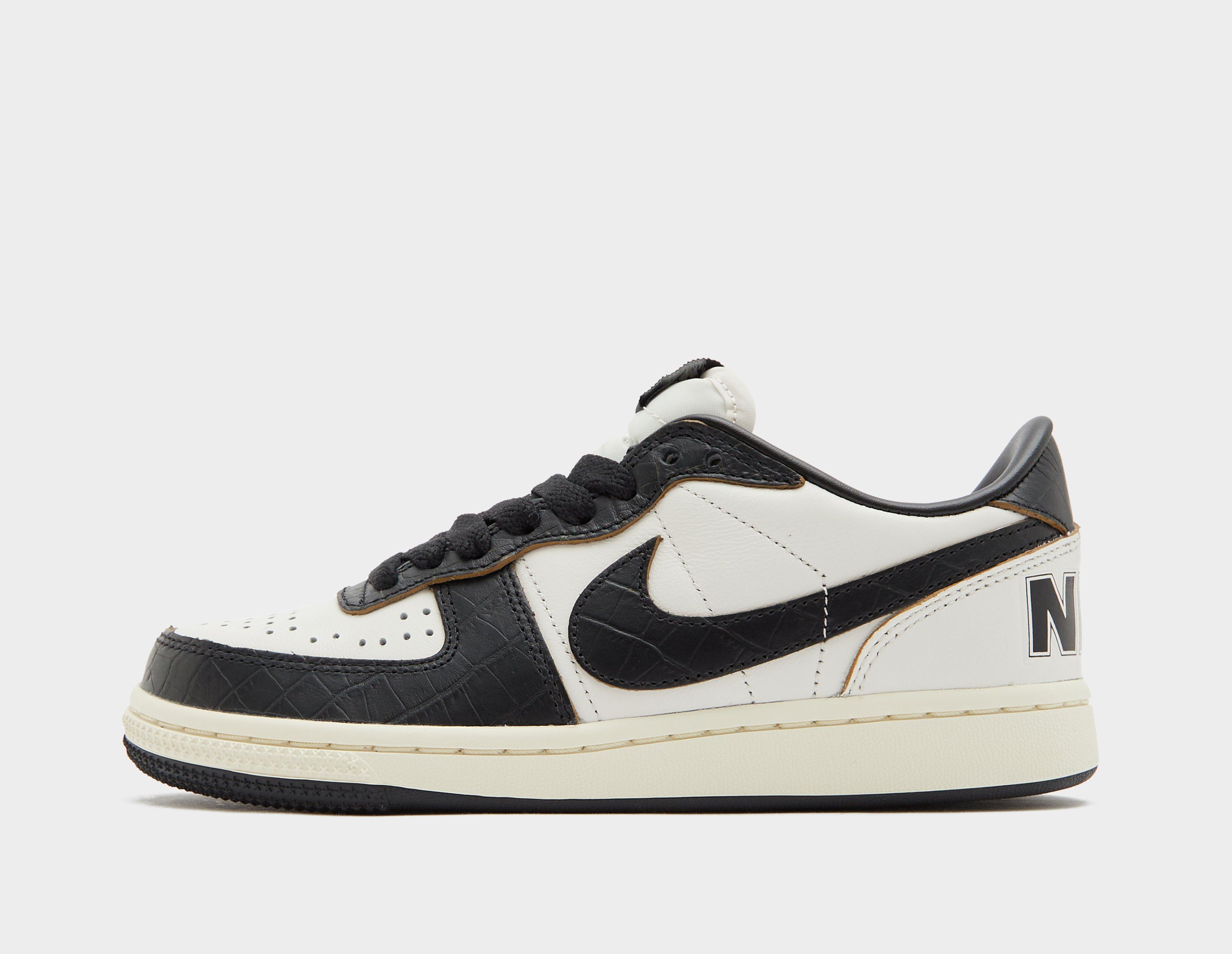 Travelling back to the 1980s, Nike bring back a beloved classic from the archives - the Terminator Low. Hailing from the Golden Era of basketball, this icon returns, sporting a 'Phantom' and black colourway. Croc-embossed leather coats the Swoosh and overlays, which accentuate the perforated toe box, before meandering in waves around the tongue. Cushioned midsoles are given a vintage look in an off-white huge, while the design is rounded off by 'NIKE' branding to the heels. Relive the glory days with this revived silhouette. | FQ8127-030