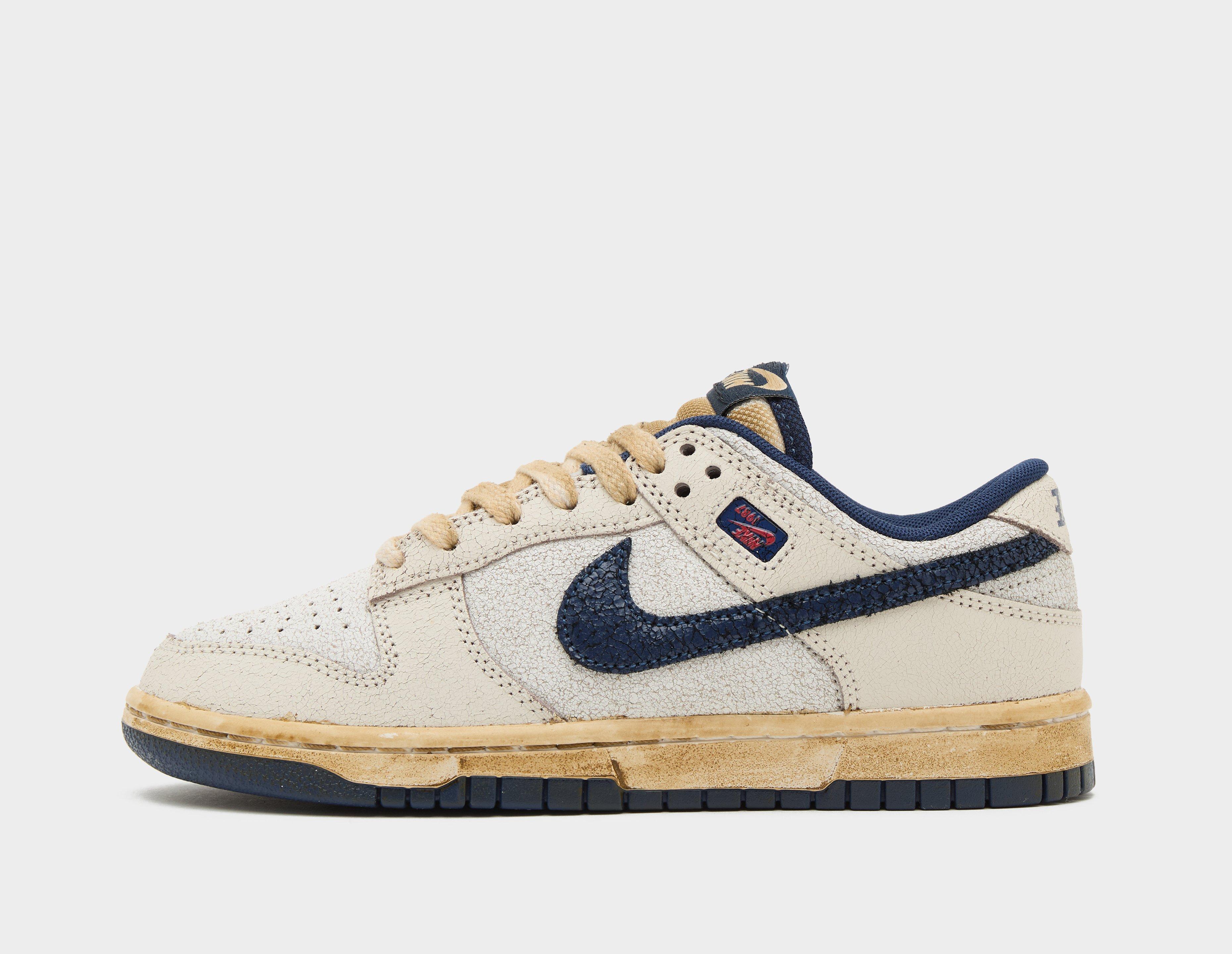 Take a wrong turn into The Upside Down as the beloved Netflix series is packaged into humanoid friendly Nike Dunk Low x Stranger Things form. Inspired by the Air Dunk from 1987 when the upcoming fifth and final season is set, Nike's Dunk Low x Stranger Things is constructed from a leather upper with crumbled details, canvas tongues and inverted logo branding. Low-cut padded collars offer up a cushioned fit, while decayed 'Midnight Navy' Swoosh insignias sketch across the sidewalls. Underfoot, stained rubber outsoles with hoops pivot circle traction evoke vintage quality and also provide responsive grip for when you're on the run from Vecna and his agents. The pair also comes wrapped in custom tissue paper and a bespoke box to match. | IH6766-001