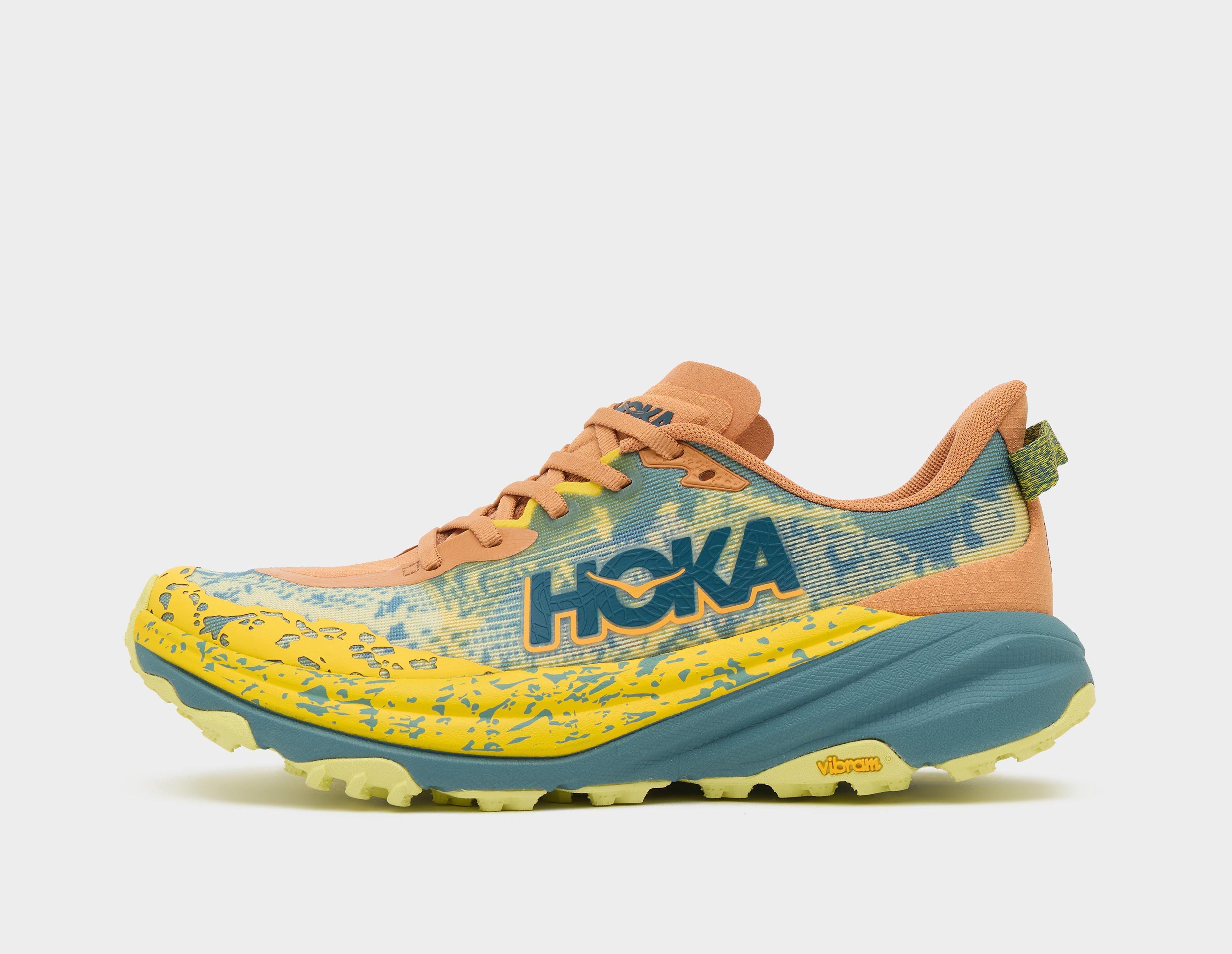 Made for the trails and uneven urban cobblestones, HOKA's vegan-friendly Speedgoat 6 arrives in 'Terra Cotta' and 'Mountain Fog'. A lightweight breathable woven upper boasts printed branding on the sidewalls and a cushioned dual gusset tongue for extra protection. Below, an internal support chassis offers a supportive hold, while a Vibram Megagrip outsole with Traction Lug delivers grip across tricky terrains. | 1147791-TTT